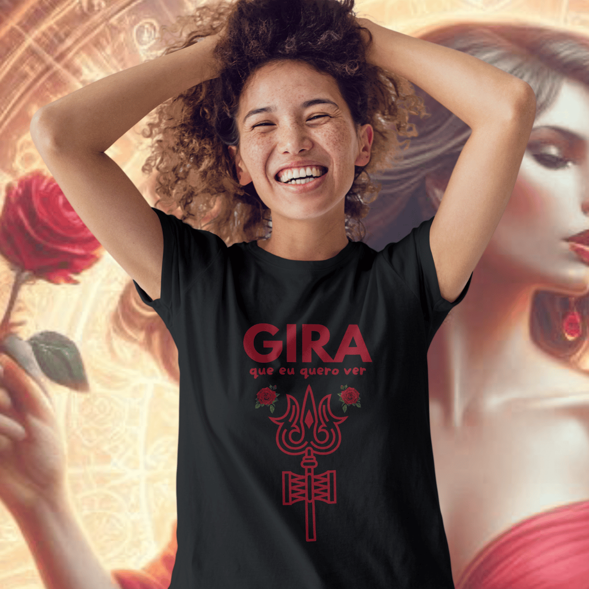 A estampa "Gira que eu quero ver" exalta a força, a liberdade e a sabedoria da Pombagira (Bombogira), entidade que transita entre os mundos, com seu charme irresistível e sua energia poderosa. Com ela, a proteção, a transformação e a autoconfiança são invocadas, conectando-nos à nossa essência e liberdade interior.