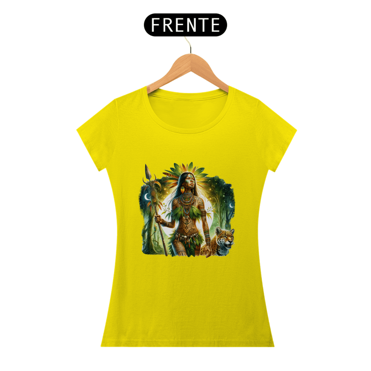 A Cabocla das Matas emerge da floresta, imponente e espiritual. Sua pele é adornada com pinturas tribais, vestindo folhas, penas e colares de sementes. Com um cajado sagrado e uma onça ao seu lado, ela irradia força e conexão ancestral sob a luz da lua, em harmonia com a natureza.
