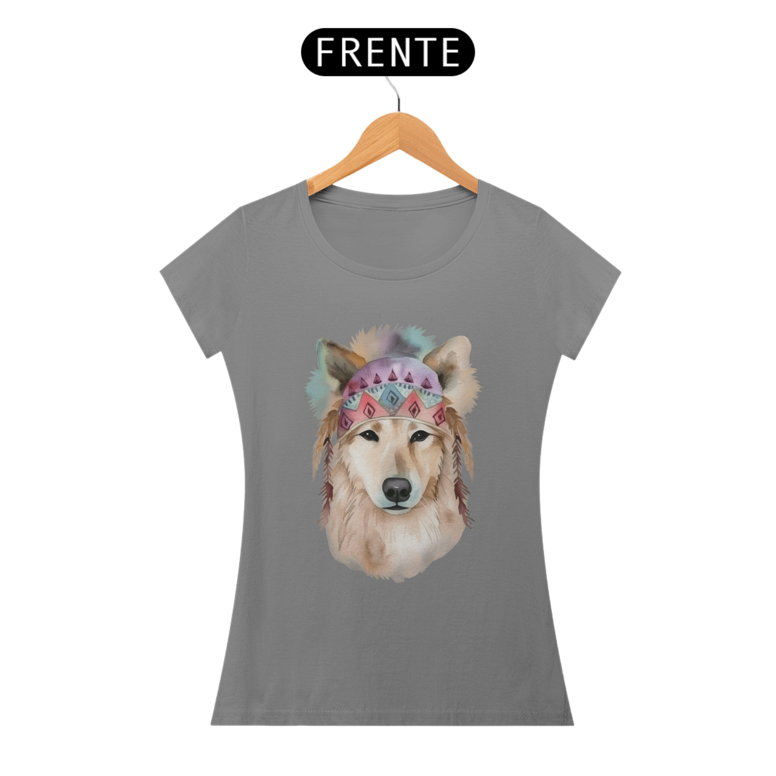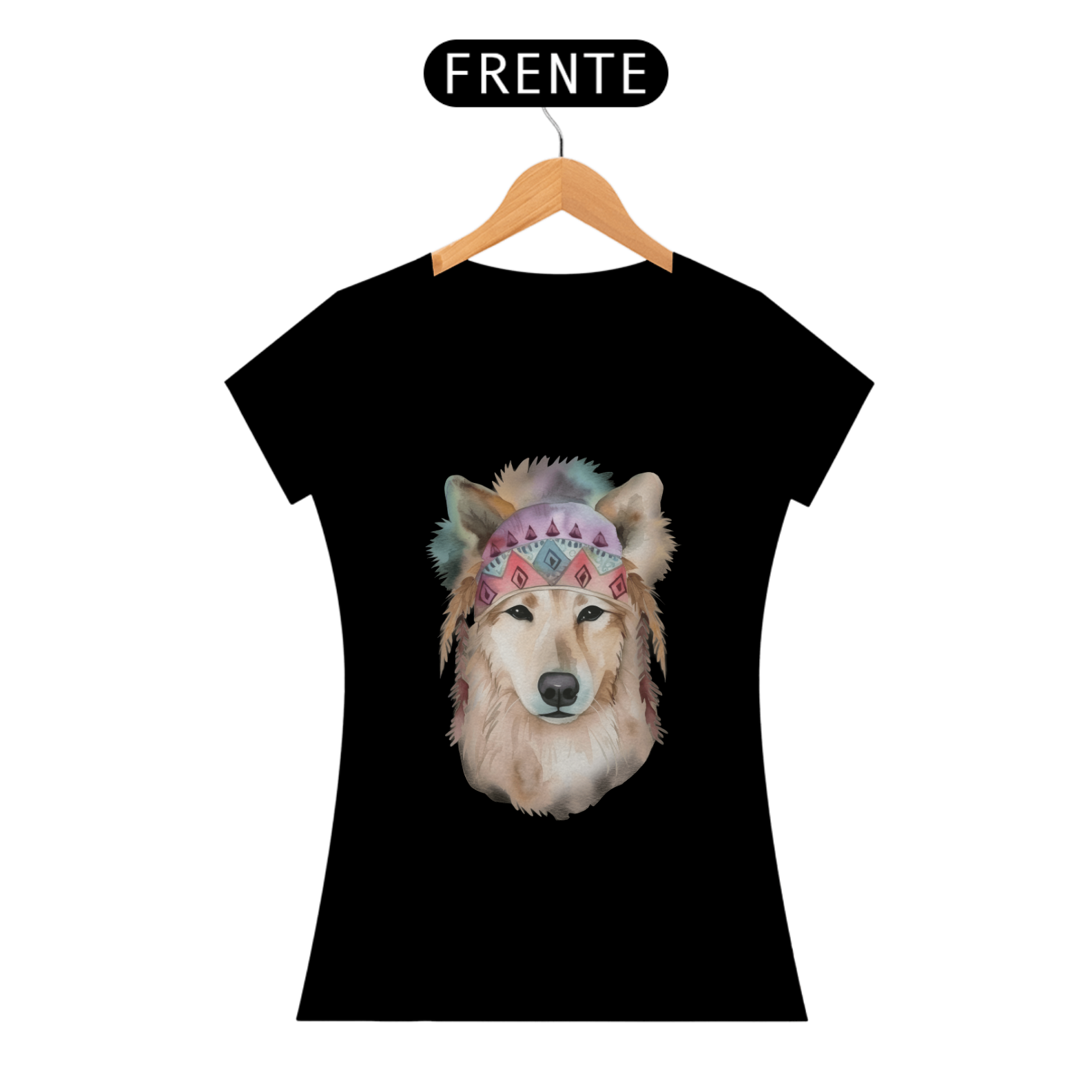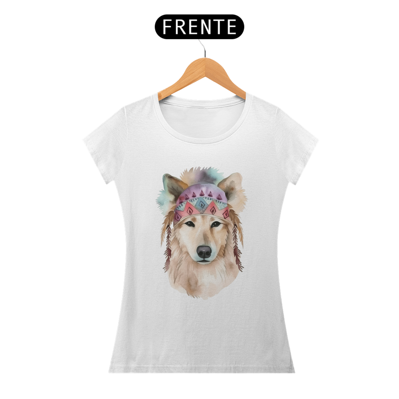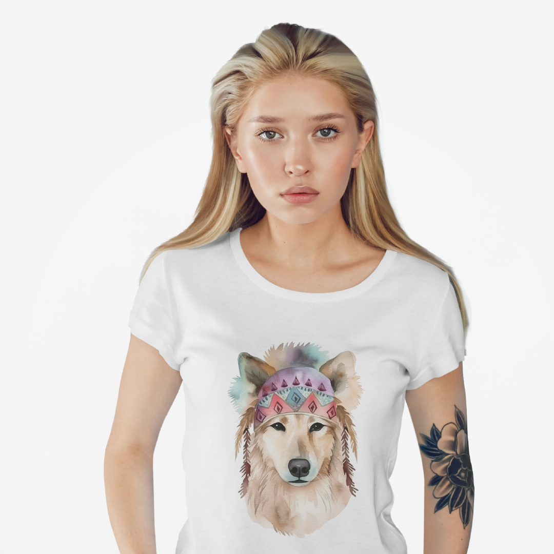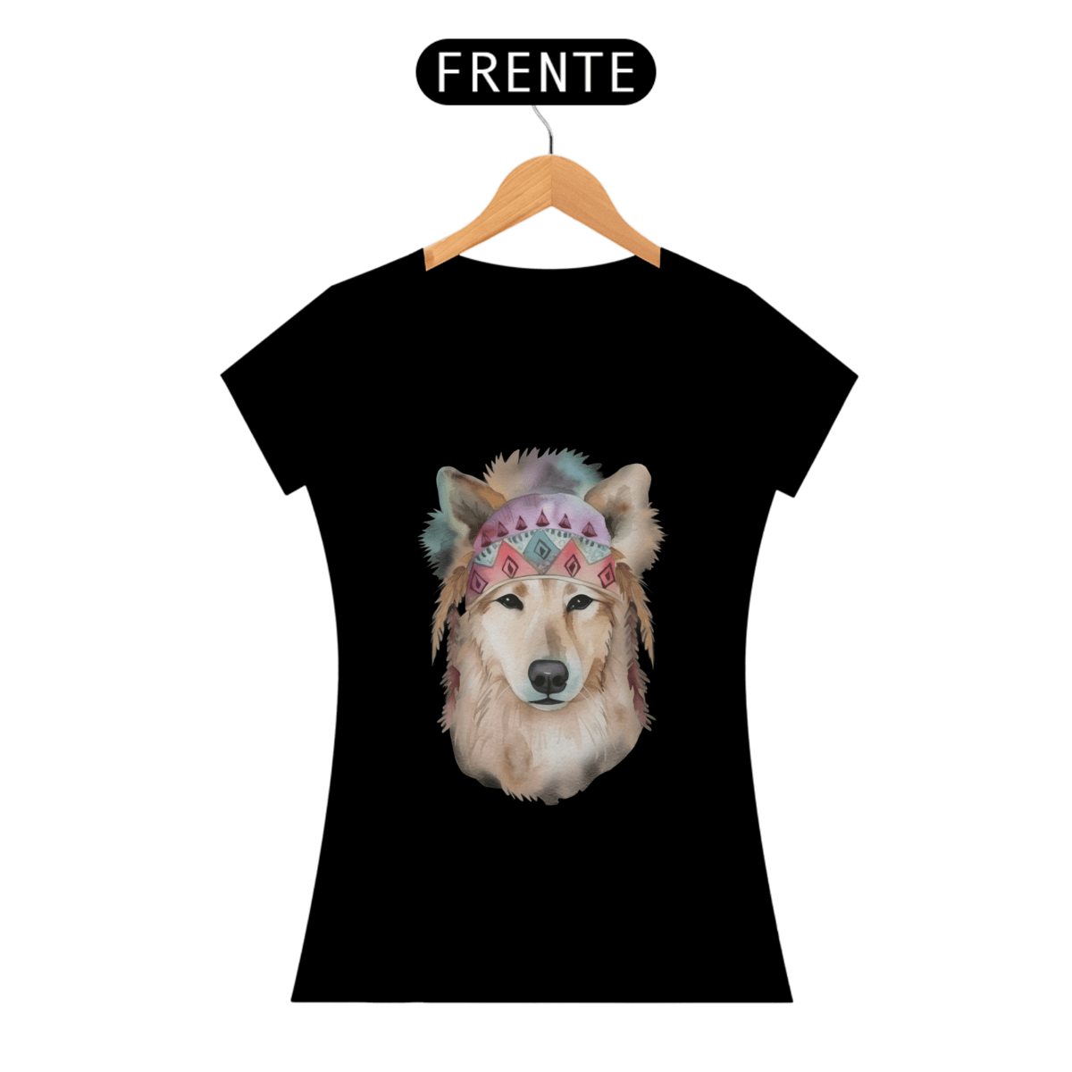 Uma ilustração delicada de um cachorro em aquarela, com estilo boho. O cão usa uma bandana colorida com padrões geométricos e penas pendentes, transmitindo leveza e serenidade. Tons suaves como rosa e azul, combinados à estética boho, conferem um toque artístico e acolhedor à imagem.