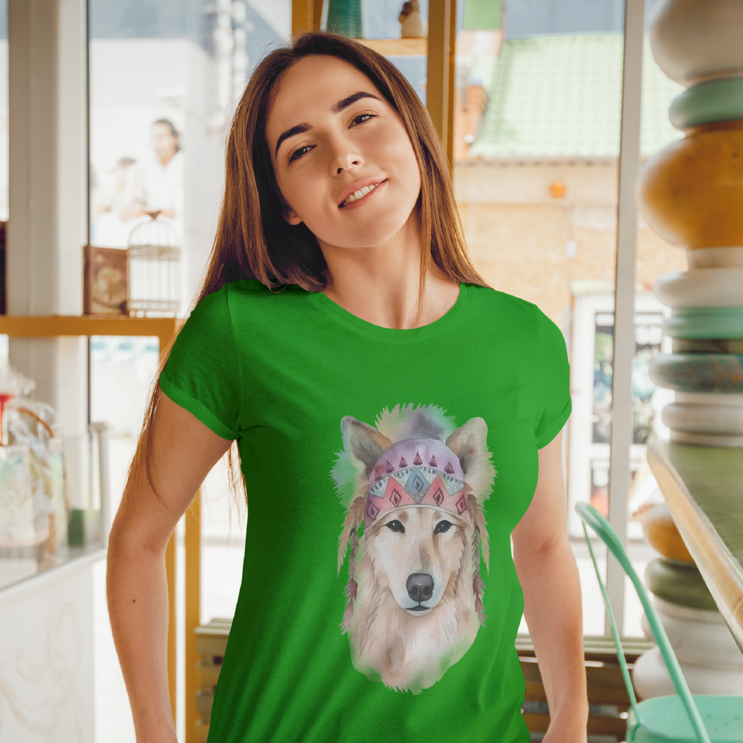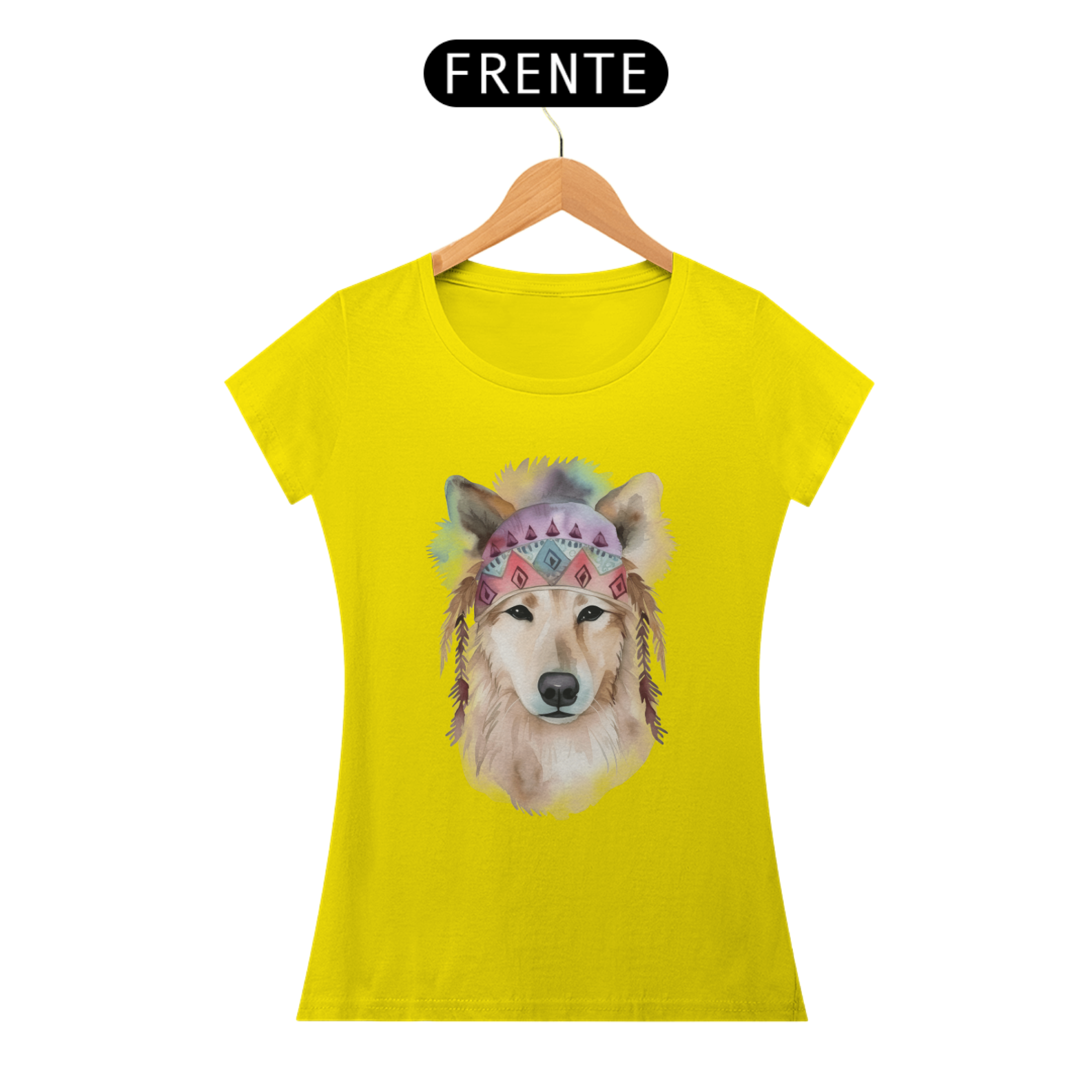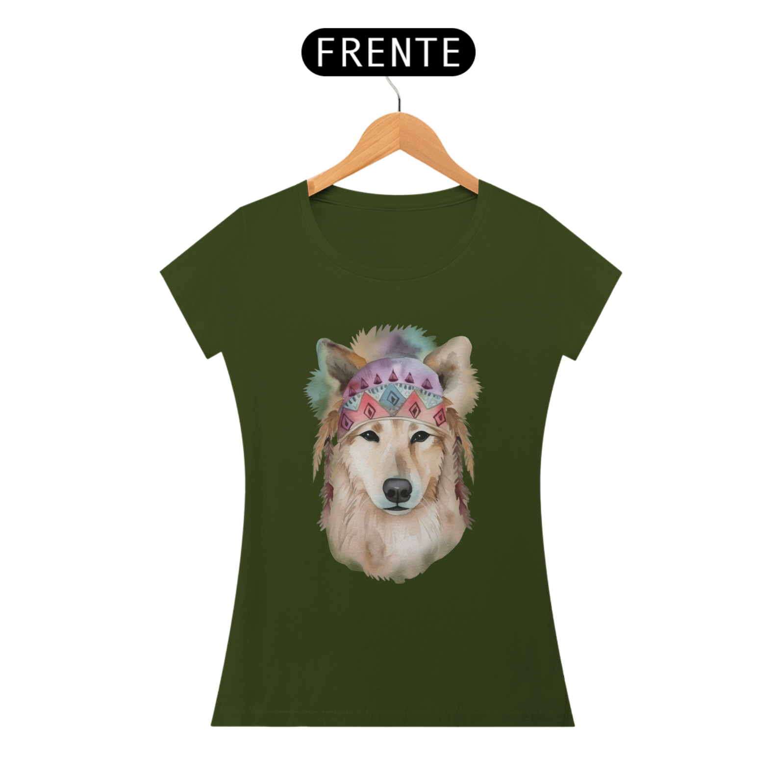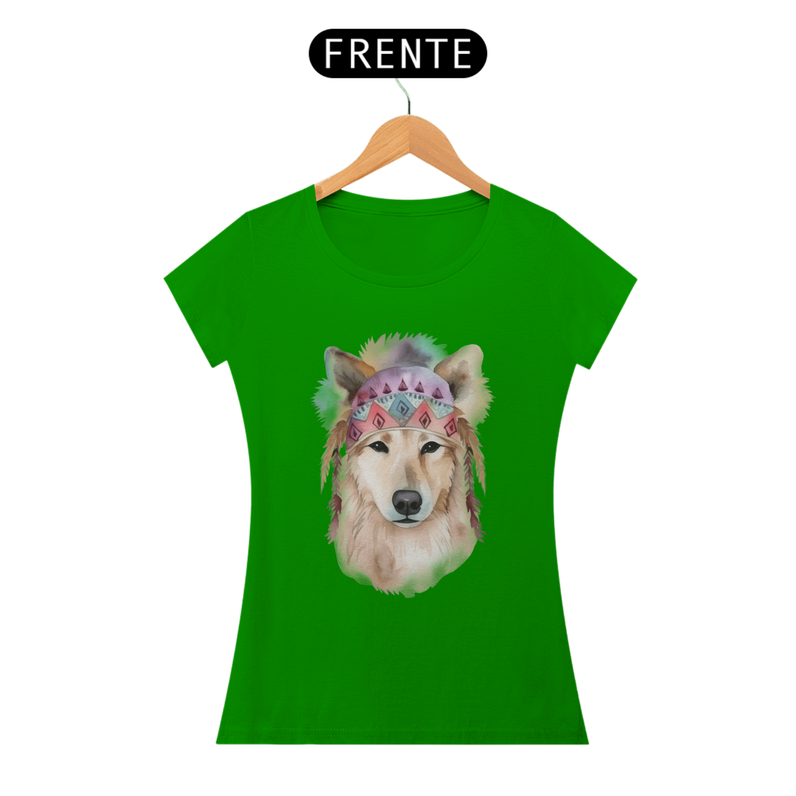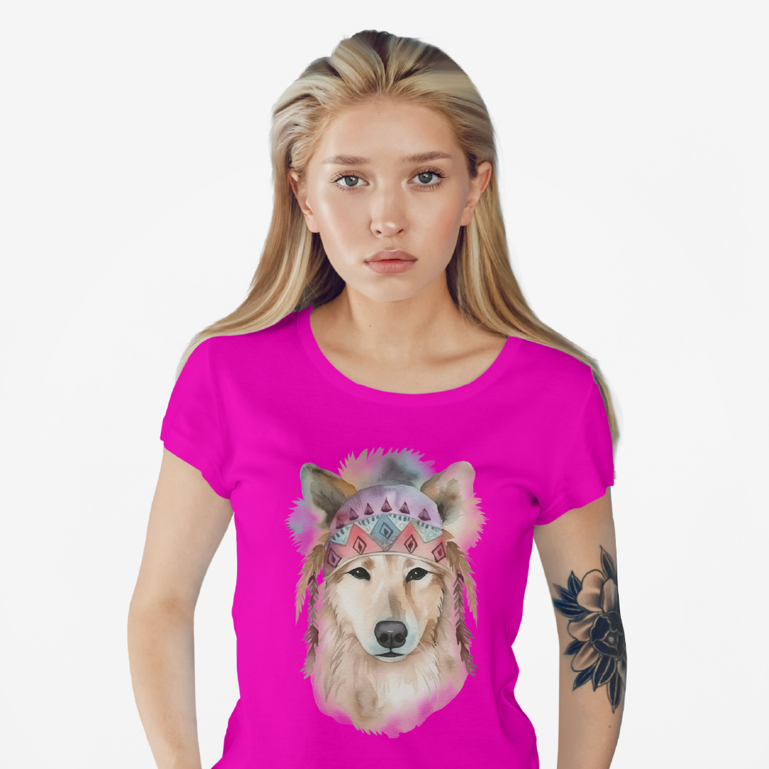 Uma ilustração delicada de um cachorro em aquarela, com estilo boho. O cão usa uma bandana colorida com padrões geométricos e penas pendentes, transmitindo leveza e serenidade. Tons suaves como rosa e azul, combinados à estética boho, conferem um toque artístico e acolhedor à imagem.