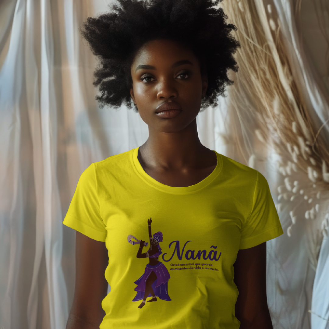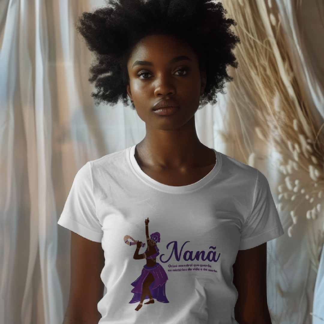 Nanã, a grande mãe ancestral, é a Orixá da sabedoria, paciência e renovação. Guardiã dos mistérios da vida e da morte, sua energia nos conecta às raízes, ao ciclo da existência e ao poder da transformação. Vestir sua estampa é honrar a serenidade, o cuidado e a profundidade que ela representa.