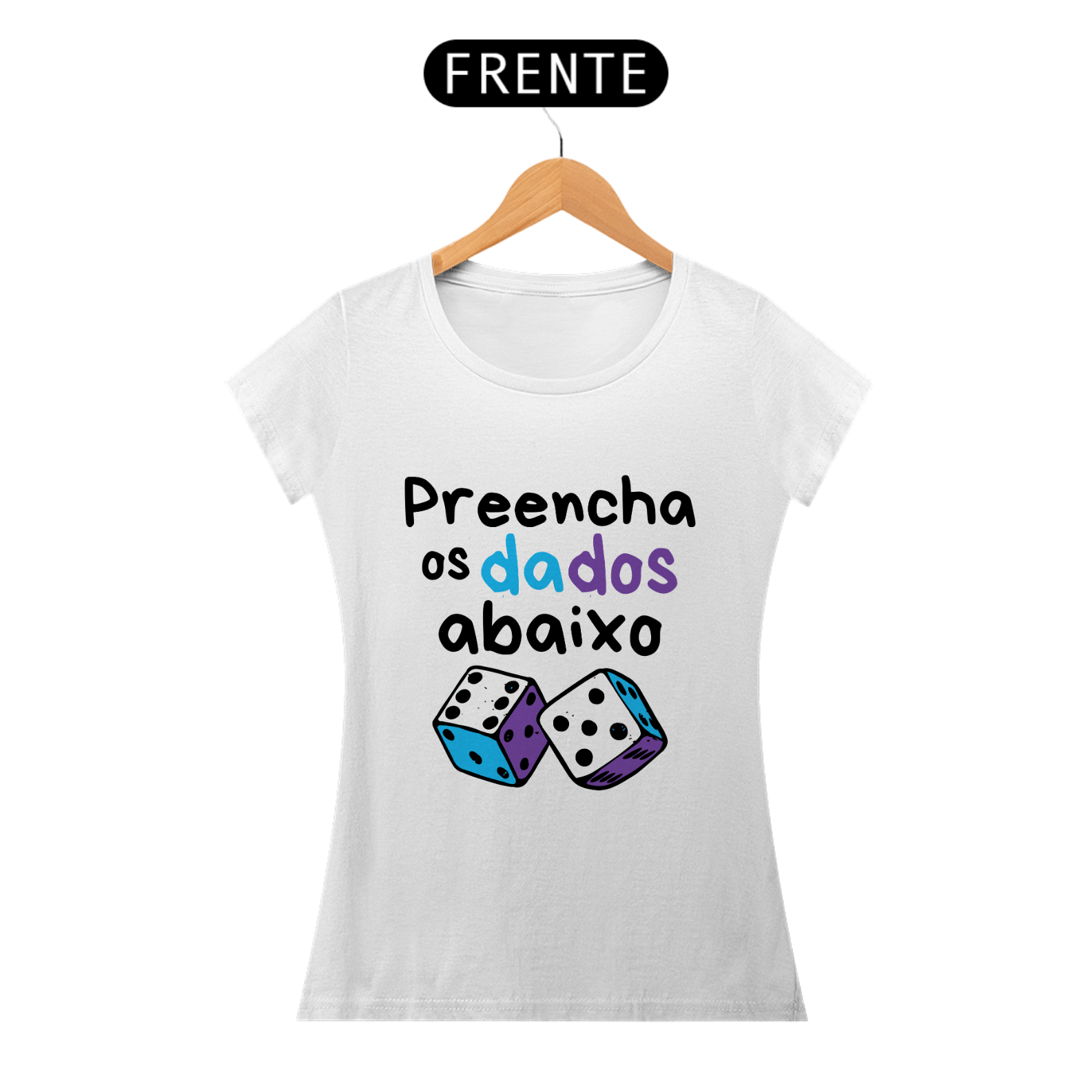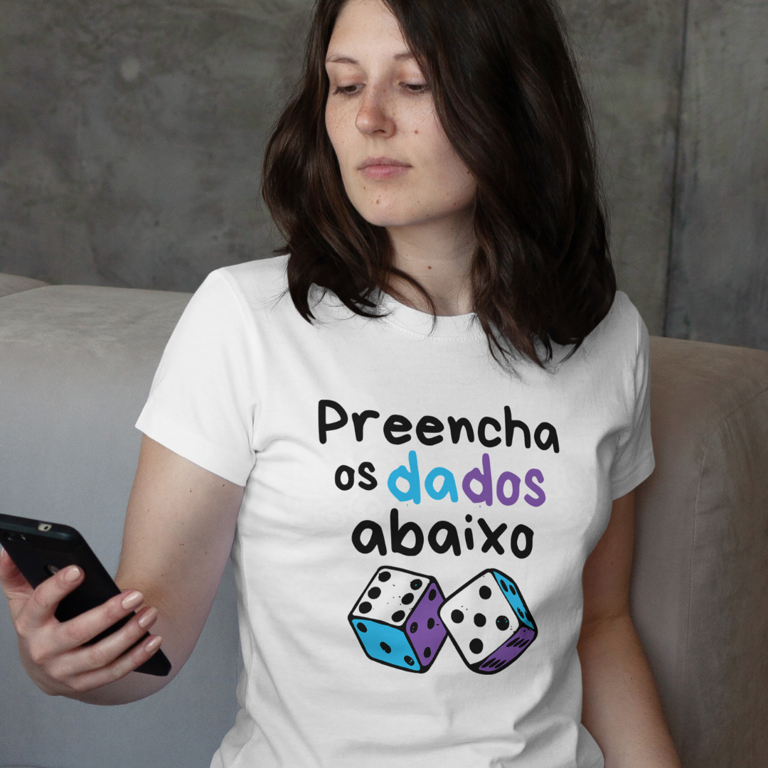 Humor inteligente para quem gosta de jogos e trocadilhos! A estampa “Preencha os dados abaixo” mistura o mundo dos formulários com os dadinhos de jogo, trazendo leveza, cor e diversão para quem veste.