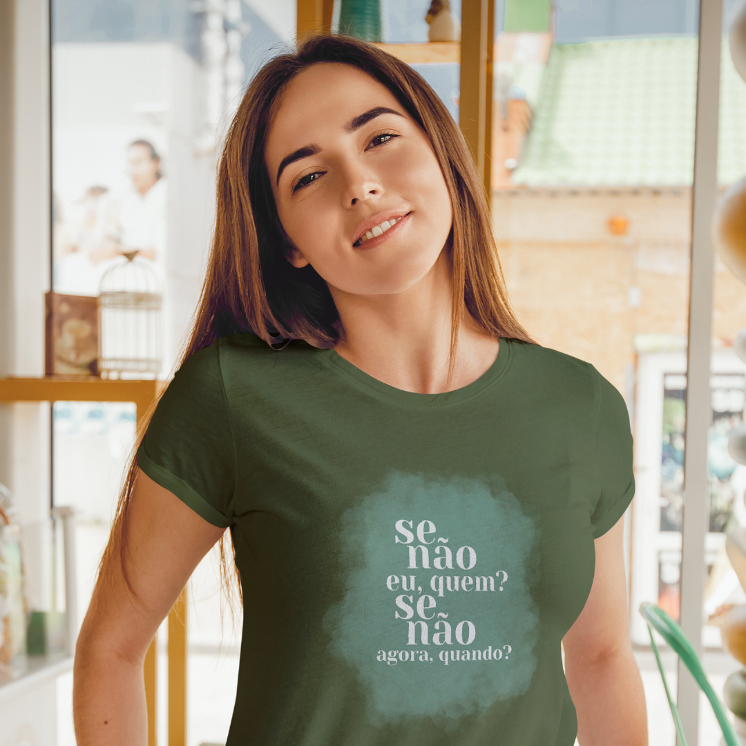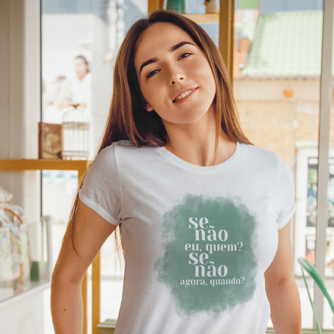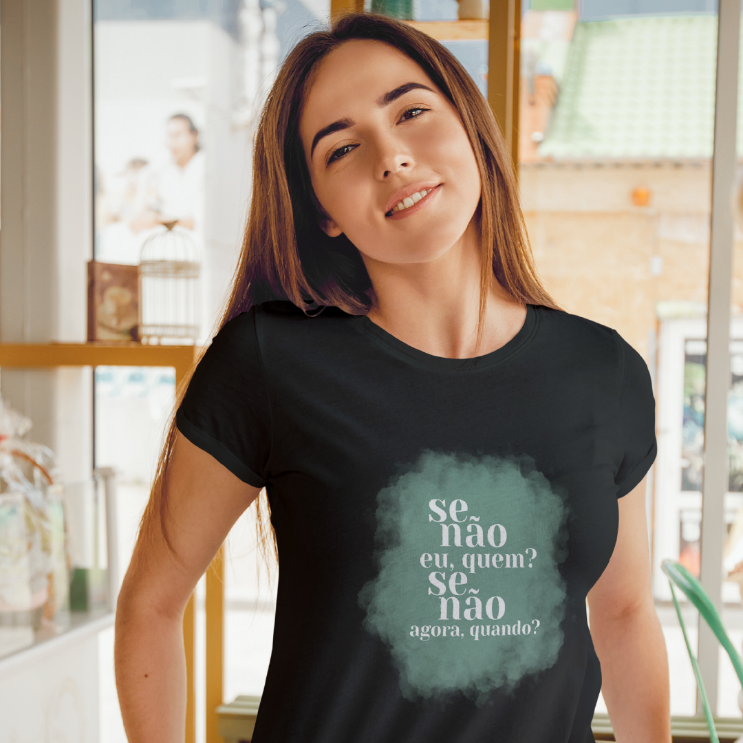 A estampa "Se não eu, quem? Se não agora, quando?" inspira a ação e o protagonismo. Na linha da marca ExpanSer, essa frase é um chamado à expansão pessoal: é o impulso para assumir o próprio caminho e viver plenamente, sem esperar por momentos ideais. É um lembrete de que o poder de transformar a realidade está em nós e começa no agora.