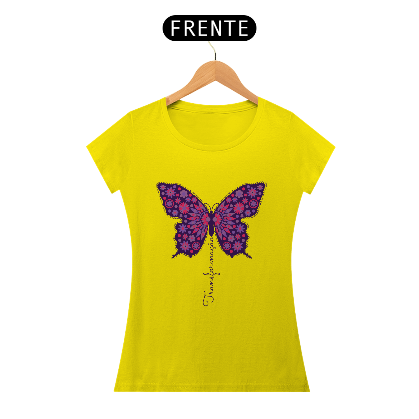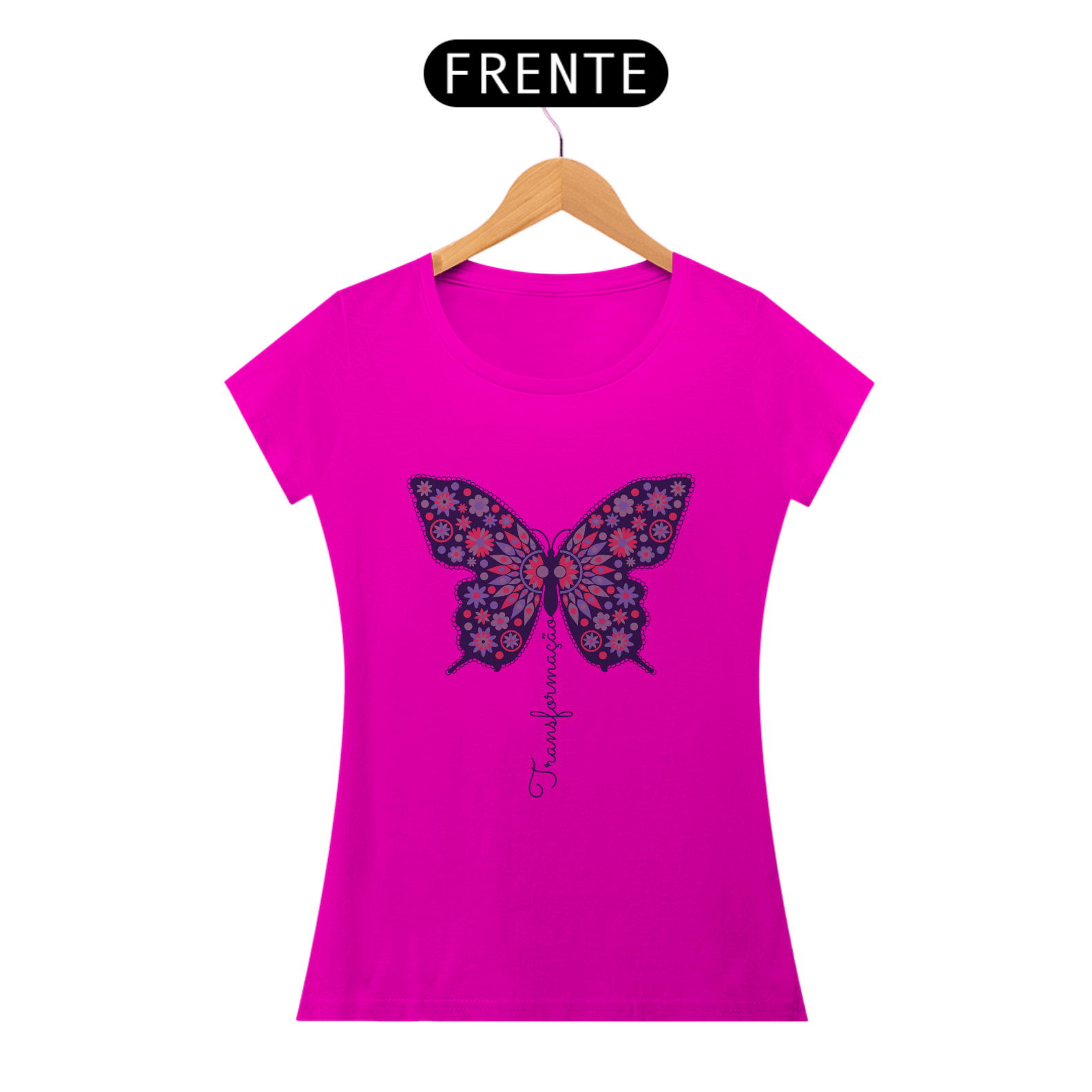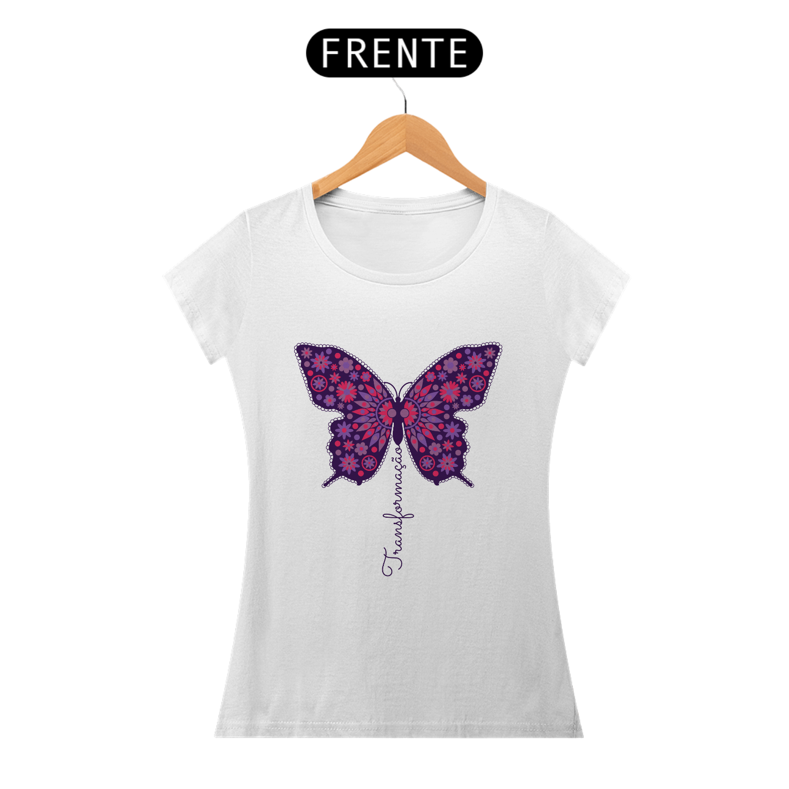 A borboleta, símbolo de renovação e evolução, ganha vida nesta estampa vibrante, adornada com padrões florais e tons de roxo e rosa. A palavra "Transformação" flui em harmonia com o design, representando o crescimento e a expansão do ser. Uma peça para quem abraça mudanças e novas possibilidades.
