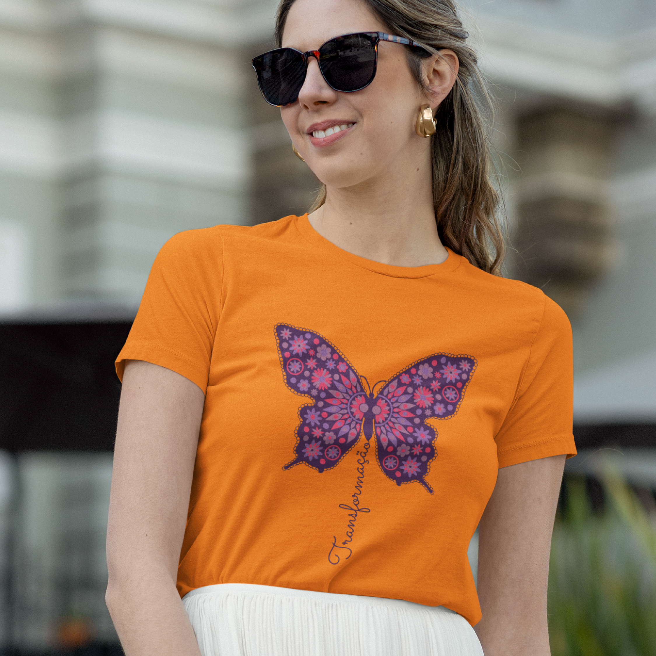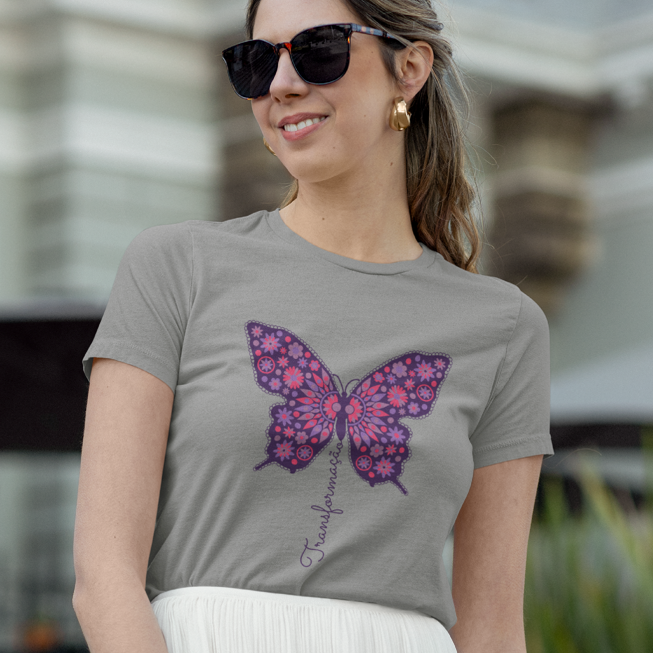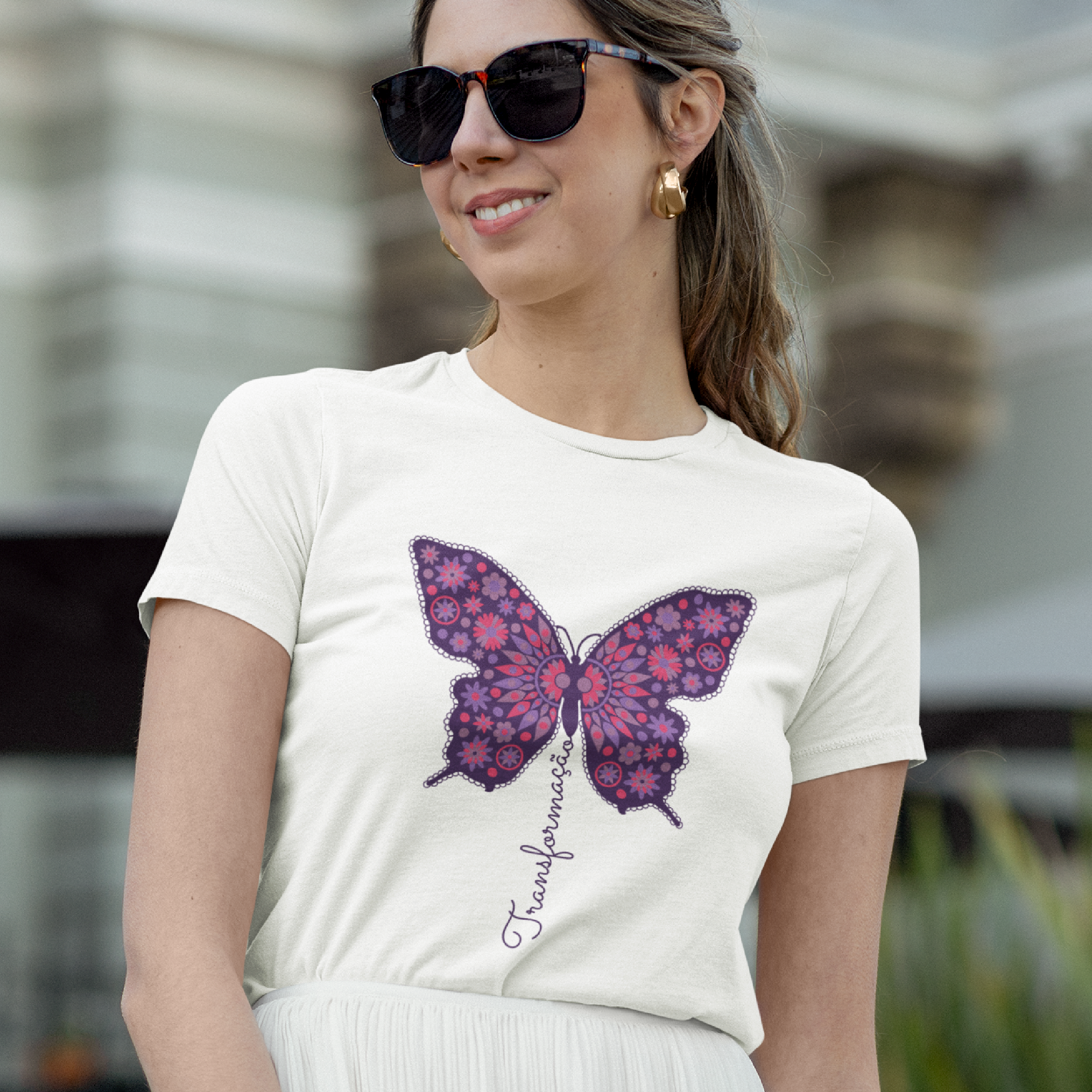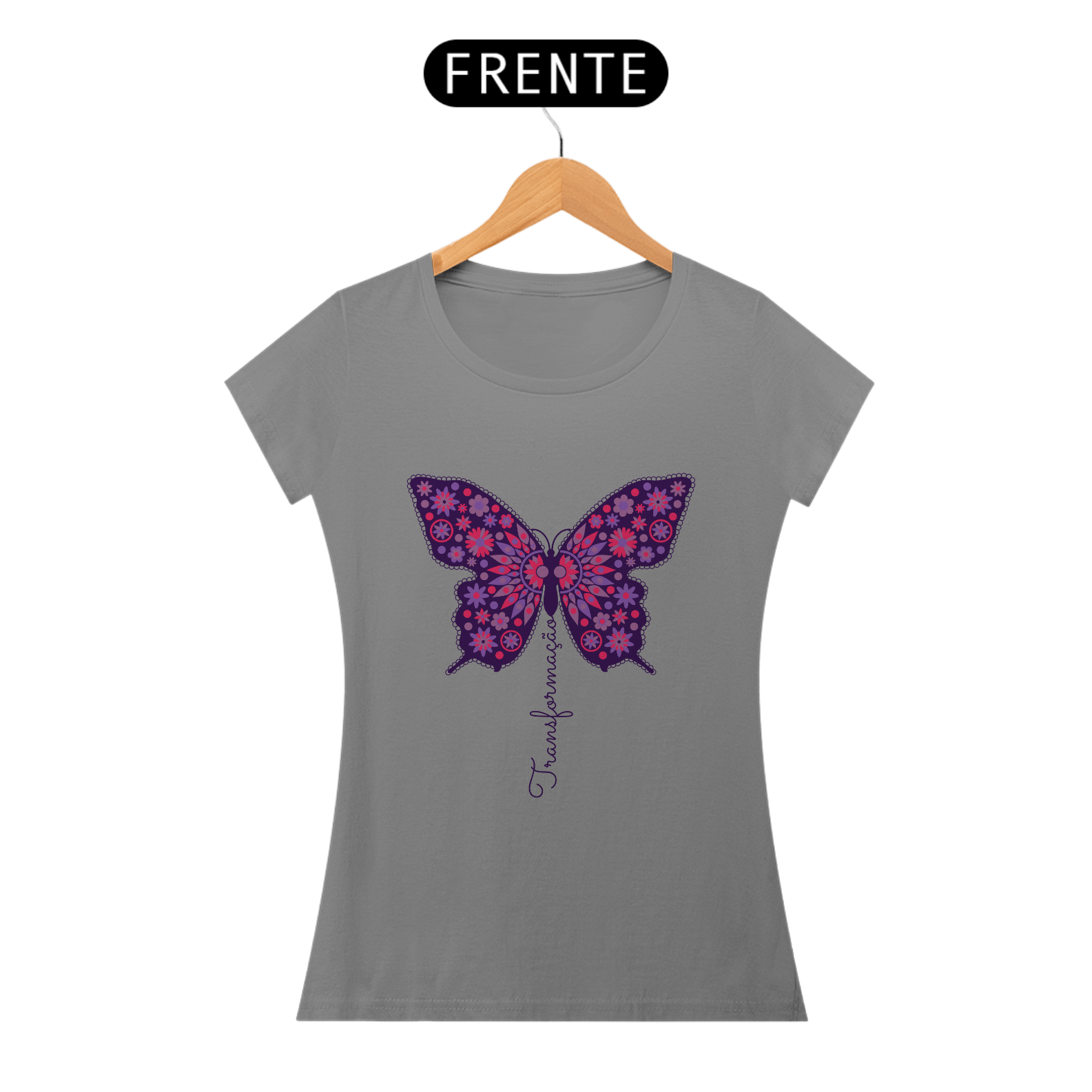 A borboleta, símbolo de renovação e evolução, ganha vida nesta estampa vibrante, adornada com padrões florais e tons de roxo e rosa. A palavra "Transformação" flui em harmonia com o design, representando o crescimento e a expansão do ser. Uma peça para quem abraça mudanças e novas possibilidades.