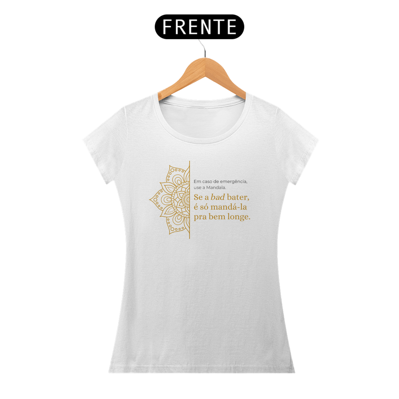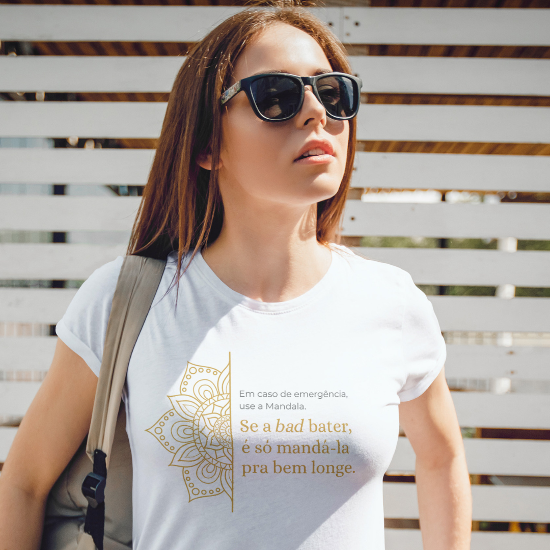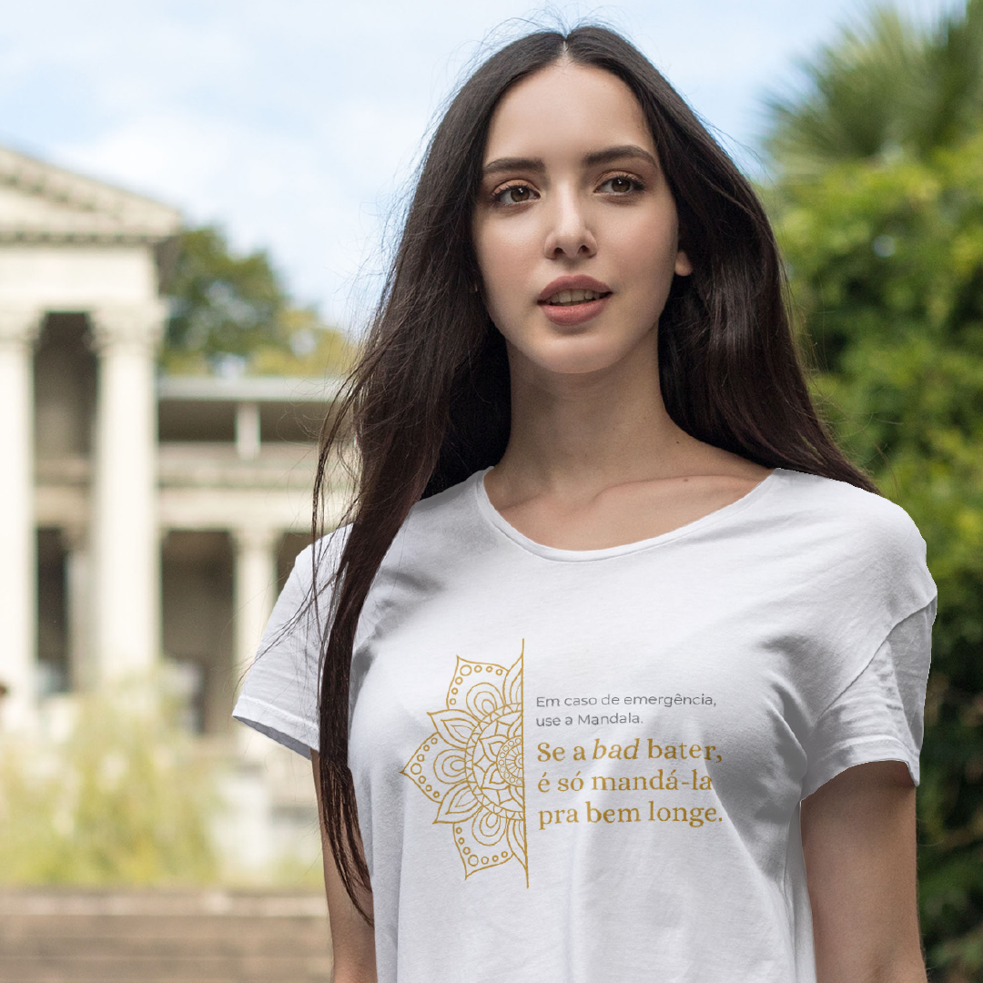 A estampa "Em caso de emergência, use a mandala. Se a bad bater, é só mandá-la pra bem longe" traz leveza e bom humor para lidar com os desafios do dia a dia. Com sua energia harmonizadora, a Mandala simboliza equilíbrio e paz interior. É um lembrete divertido de que podemos transformar momentos difíceis com positividade e uma boa dose de descontração!