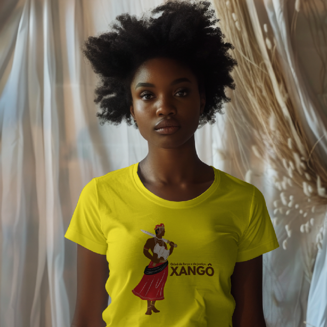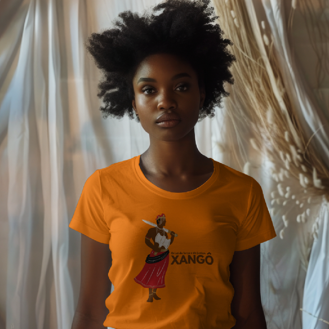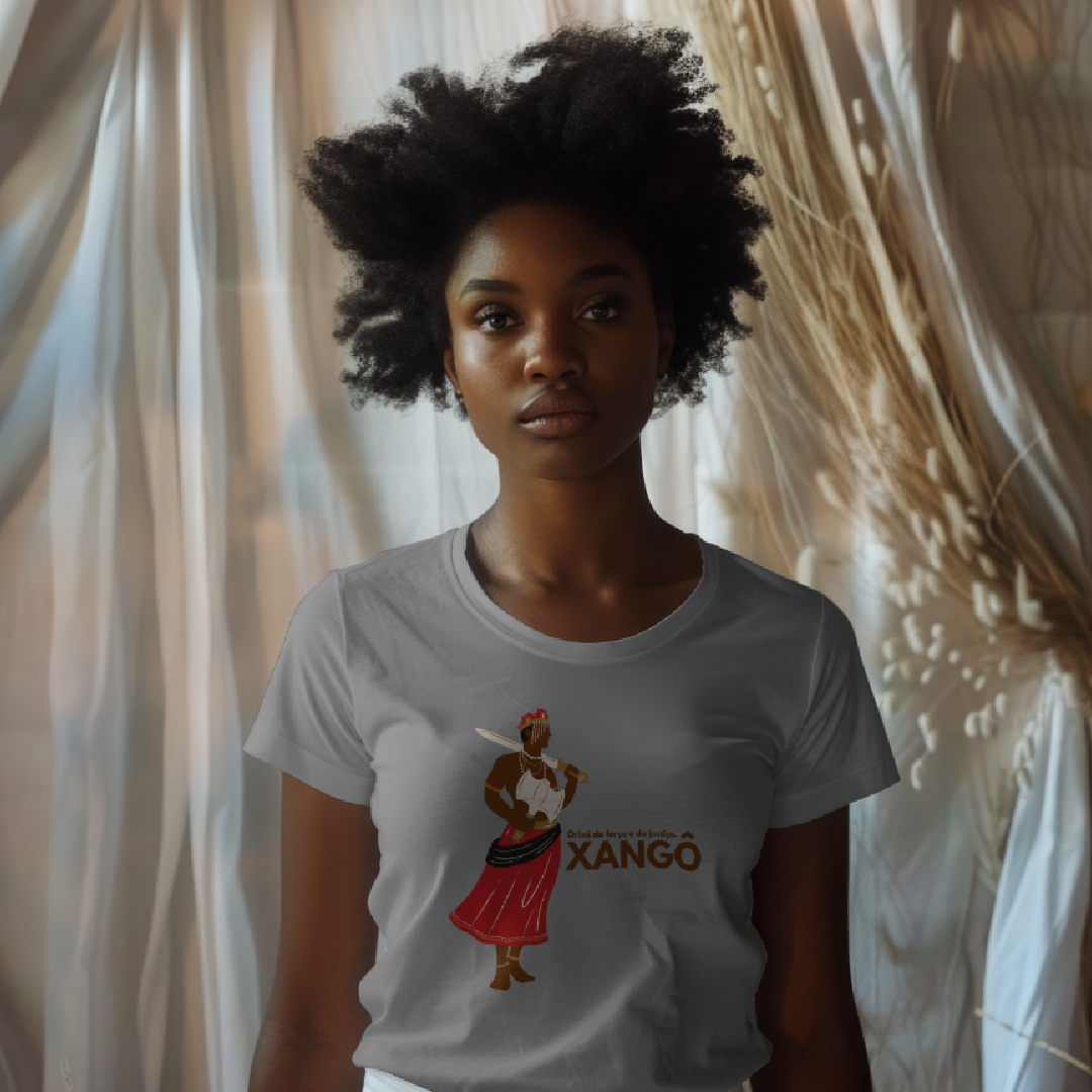 Xangô, o orixá da justiça, do fogo e dos raios. Sua força imponente e seu machado duplo simbolizam o equilíbrio e a lei. Homenageie a sabedoria e o poder de Xangô com essa estampa exclusiva. Kaô Kabecilê!