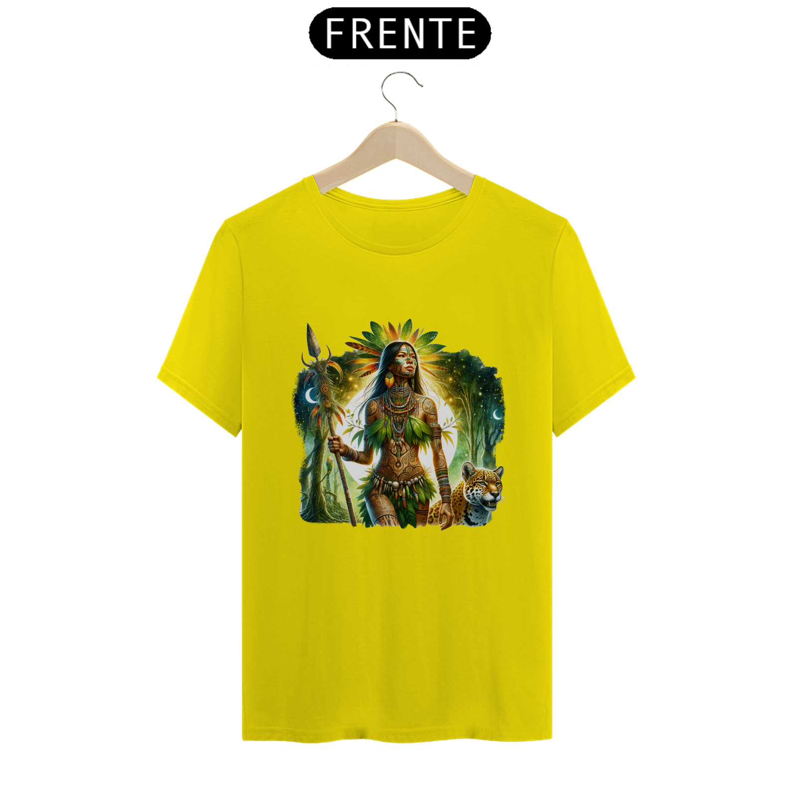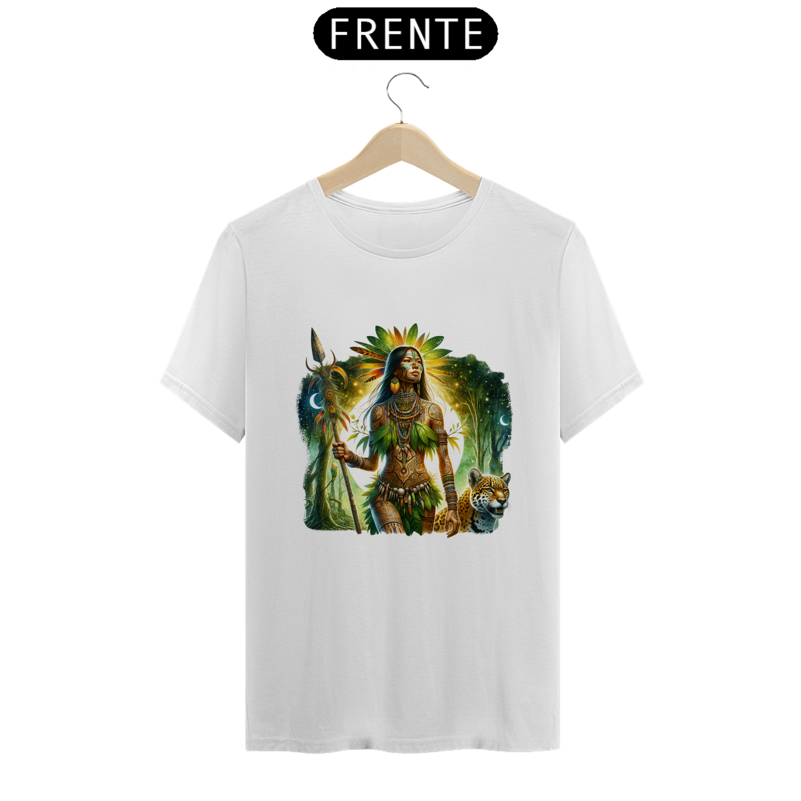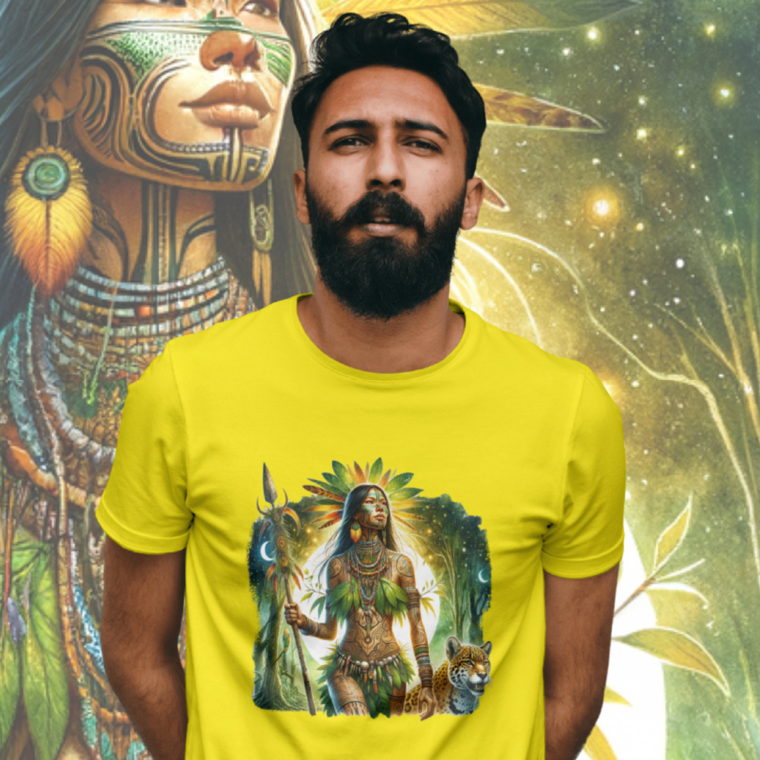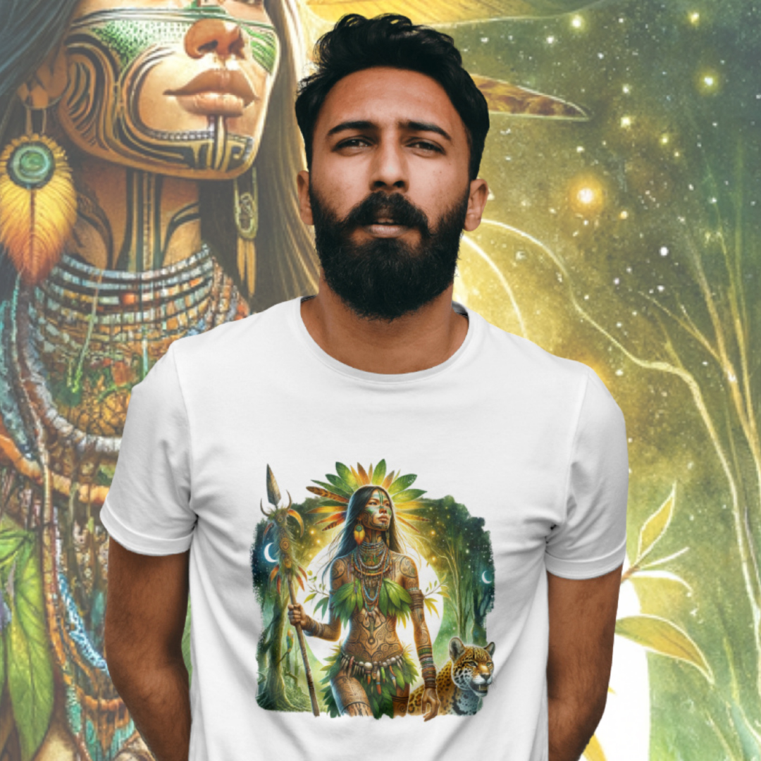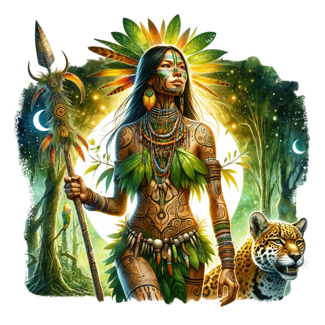 A Cabocla das Matas emerge da floresta, imponente e espiritual. Sua pele é adornada com pinturas tribais, vestindo folhas, penas e colares de sementes. Com um cajado sagrado e uma onça ao seu lado, ela irradia força e conexão ancestral sob a luz da lua, em harmonia com a natureza.