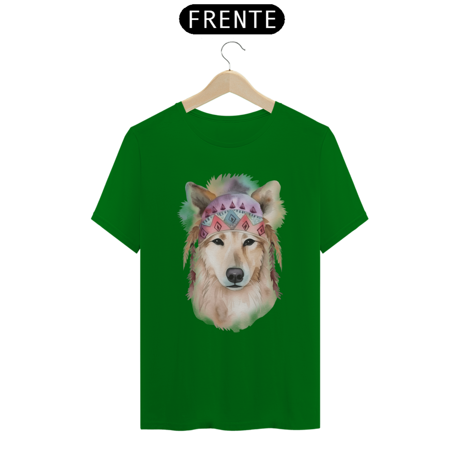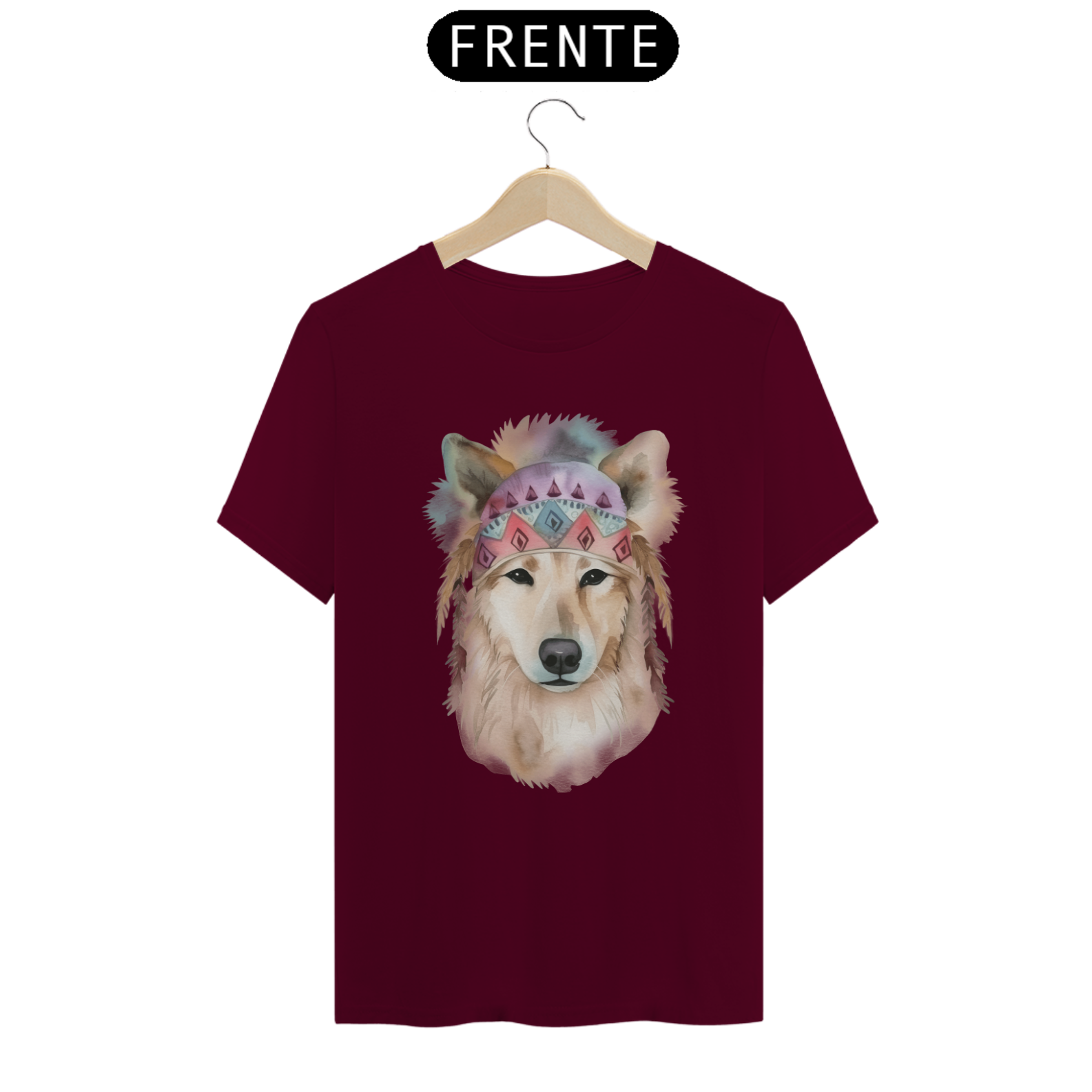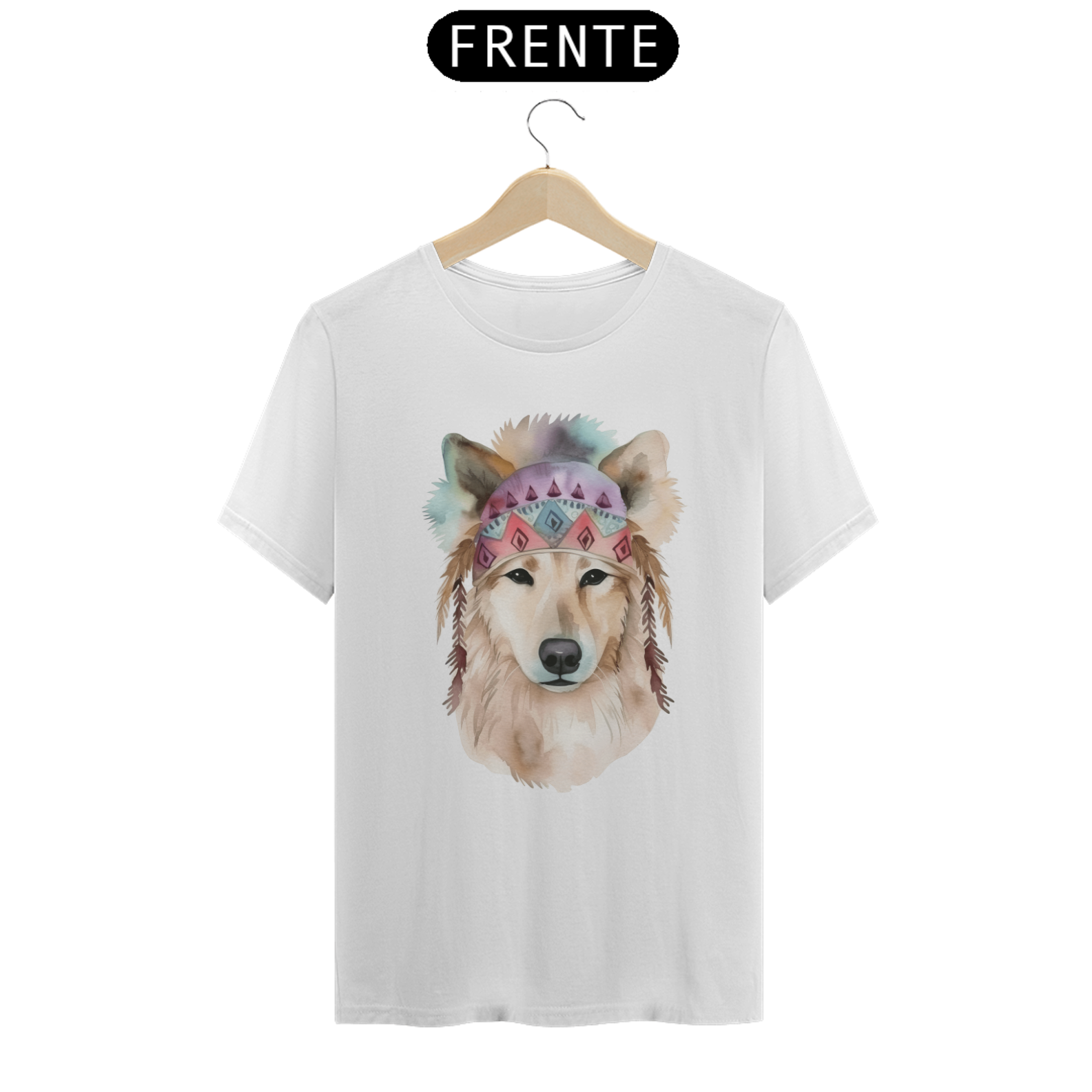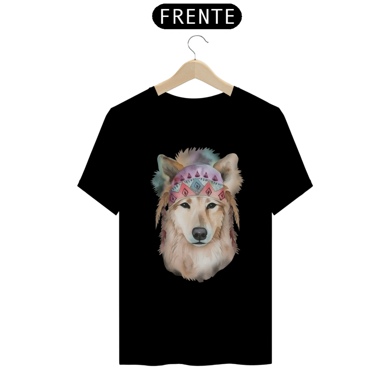 Uma ilustração delicada de um cachorro em aquarela, com estilo boho. O cão usa uma bandana colorida com padrões geométricos e penas pendentes, transmitindo leveza e serenidade. Tons suaves como rosa e azul, combinados à estética boho, conferem um toque artístico e acolhedor à imagem.