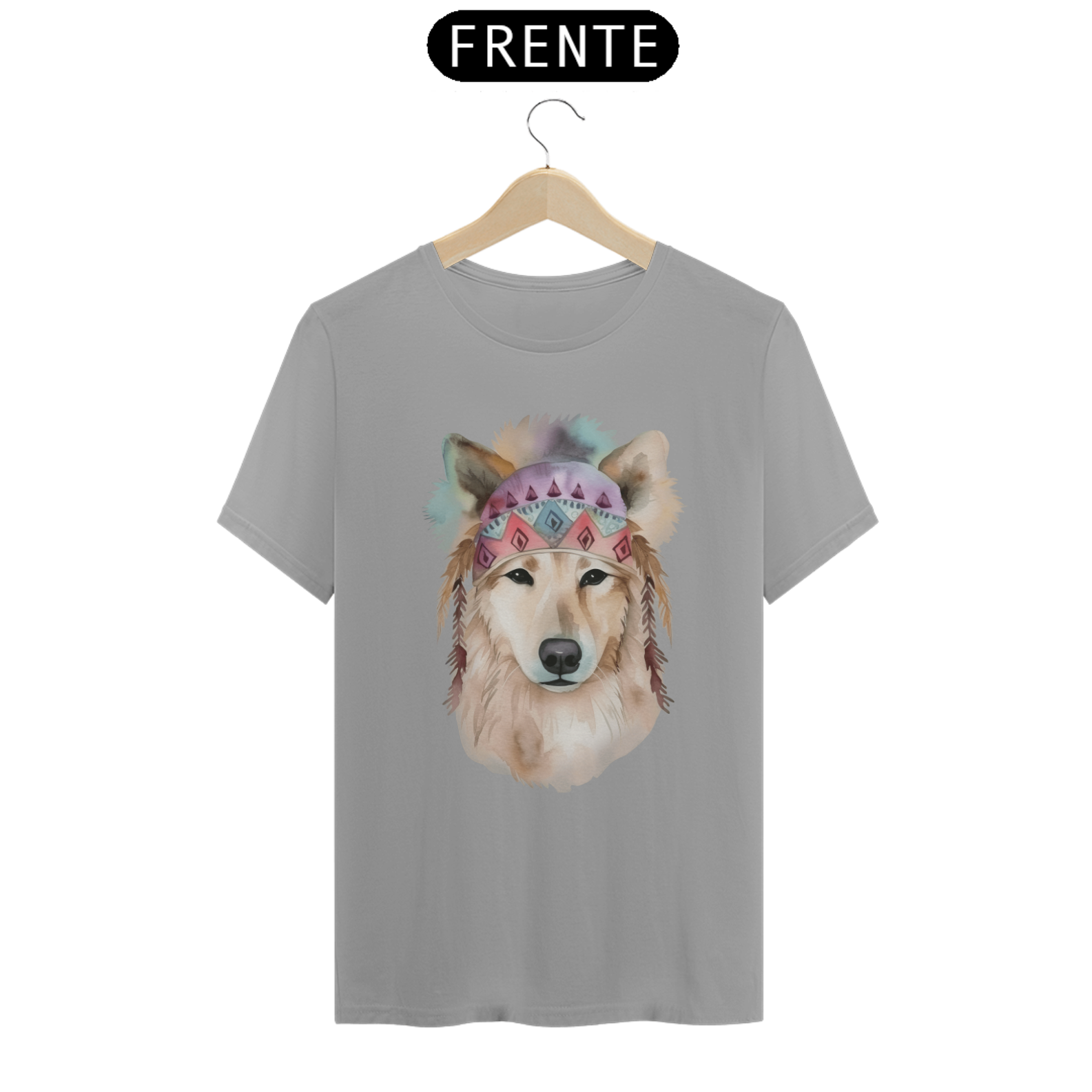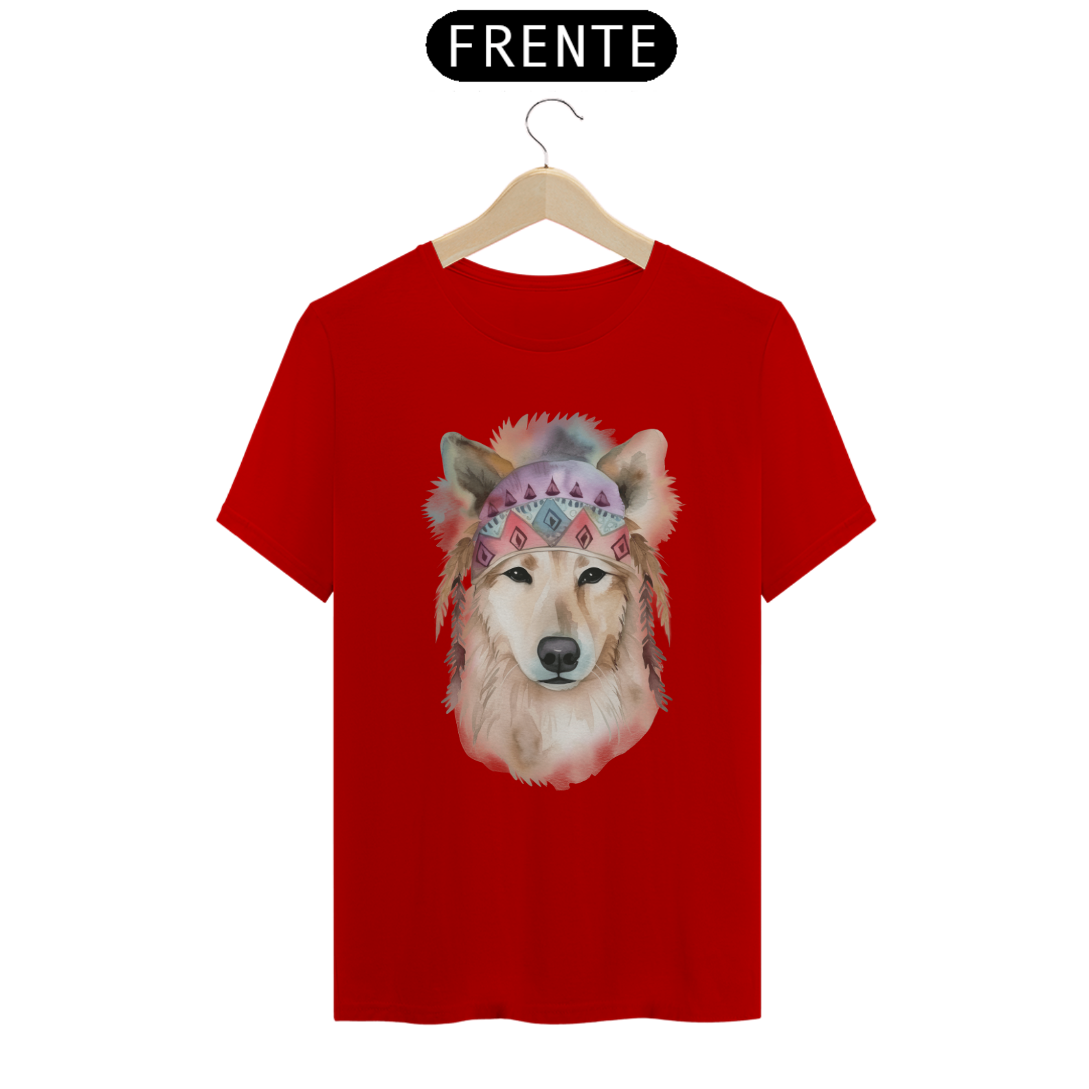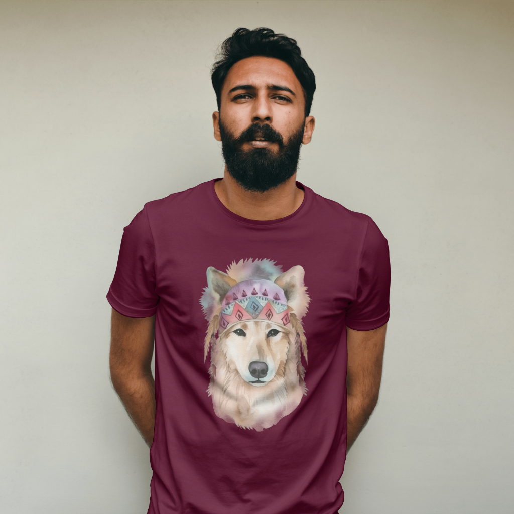 Uma ilustração delicada de um cachorro em aquarela, com estilo boho. O cão usa uma bandana colorida com padrões geométricos e penas pendentes, transmitindo leveza e serenidade. Tons suaves como rosa e azul, combinados à estética boho, conferem um toque artístico e acolhedor à imagem.