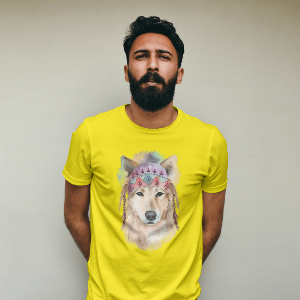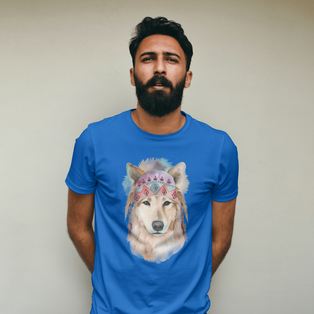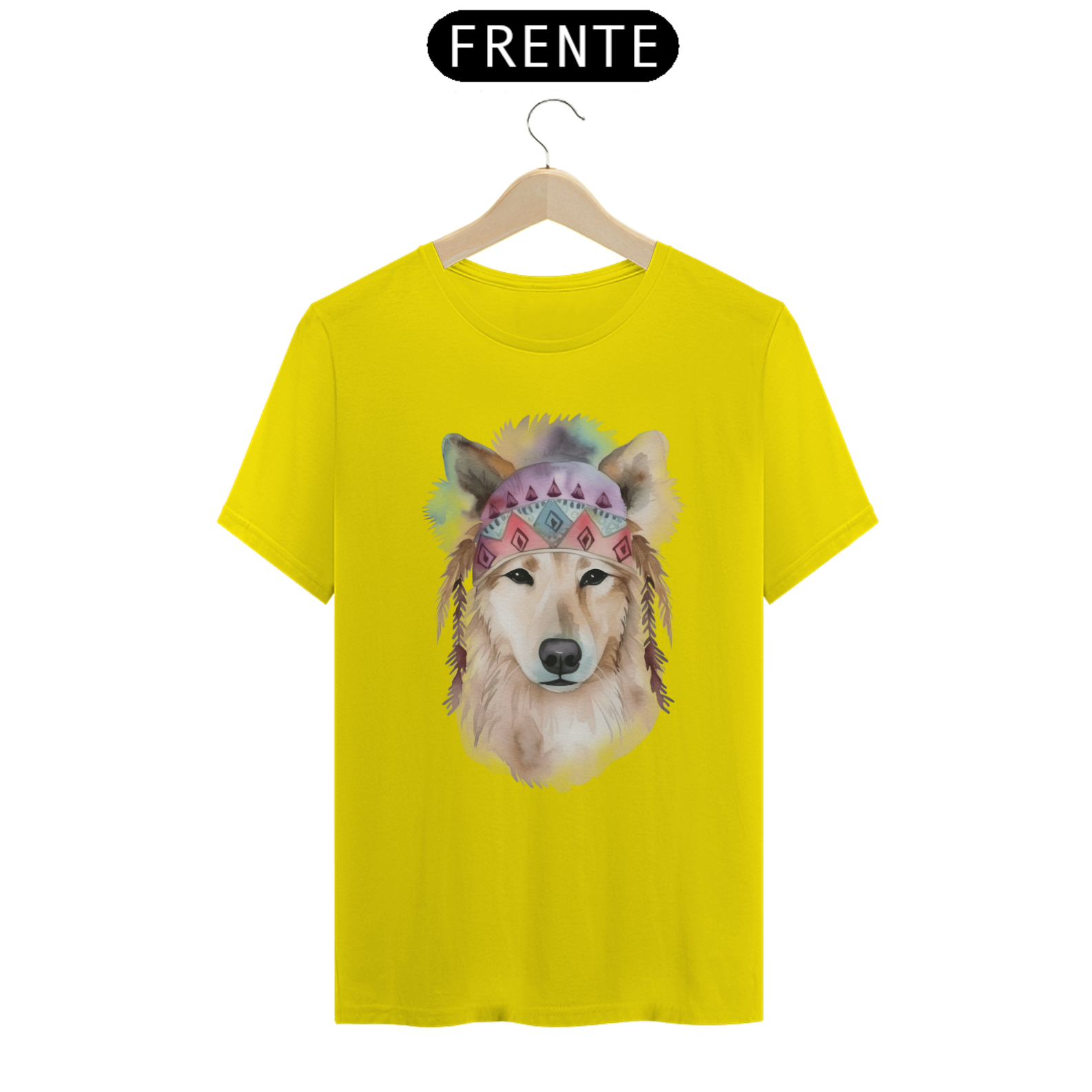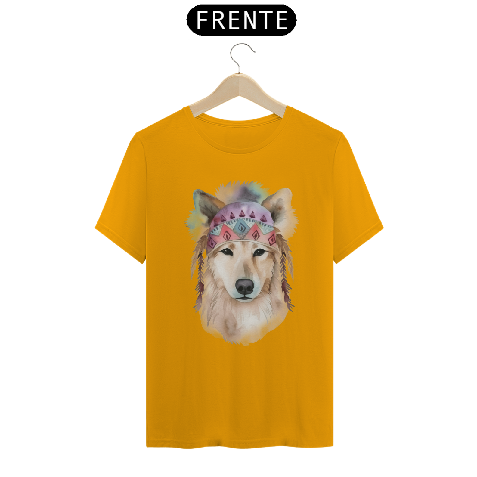 Uma ilustração delicada de um cachorro em aquarela, com estilo boho. O cão usa uma bandana colorida com padrões geométricos e penas pendentes, transmitindo leveza e serenidade. Tons suaves como rosa e azul, combinados à estética boho, conferem um toque artístico e acolhedor à imagem.