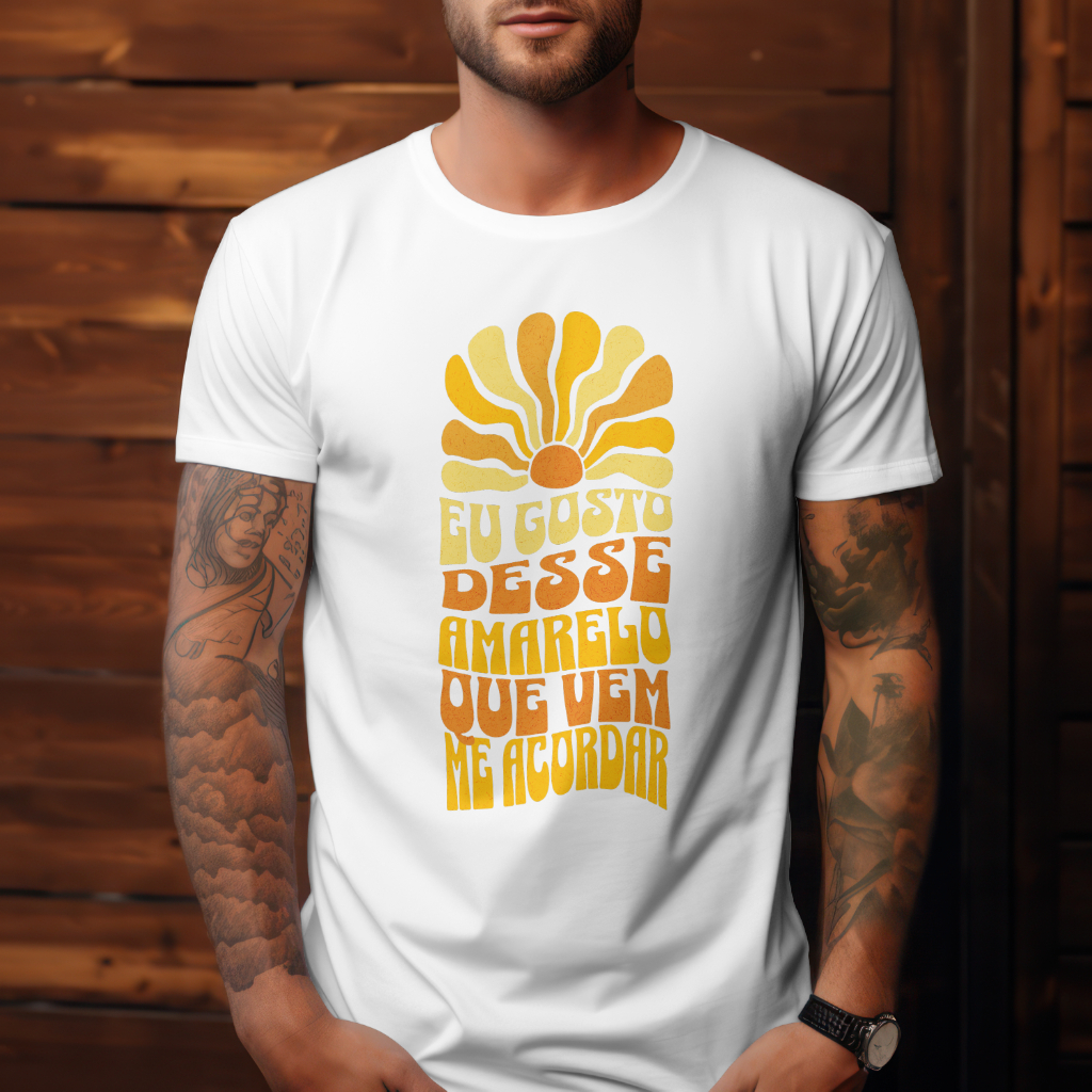 Essa estampa é pura energia solar! Com a frase "eu gosto desse amarelo que vem me acordar", retirada da música fofíssima "Cores", de Marie Gabriella. Assim como no início da música, essa estampa celebra o despertar da manhã com entusiasmo. O sol nos abraça, recarrega e nos convida a viver com alegria e leveza. Perfeita para quem aprecia o calor que desperta corpo, alma e vibração.