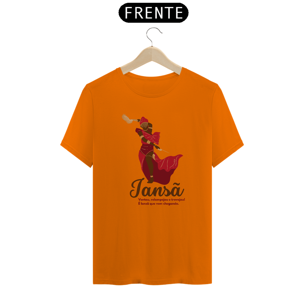 Iansã, senhora dos ventos e tempestades, é força, coragem e movimento. Sua energia transforma, varrendo o velho para abrir caminhos. A frase "Ventou, relampejou e trovejou!" simboliza sua chegada poderosa, trazendo determinação e proteção. Vestir essa estampa é vibrar na potência feminina e na renovação.