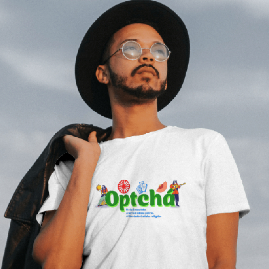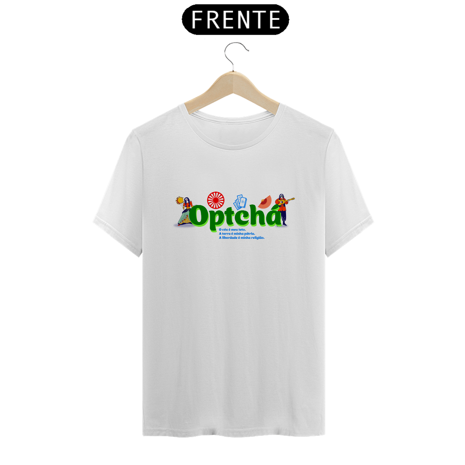 A estampa celebra o espírito cigano com a palavra Optchá, expressão de força e celebração, e a frase que ecoa a essência da cultura: "O céu é meu teto. A terra é minha pátria. A liberdade é minha religião." Um tributo à conexão com a natureza, à vida sem amarras e à busca constante pela liberdade.