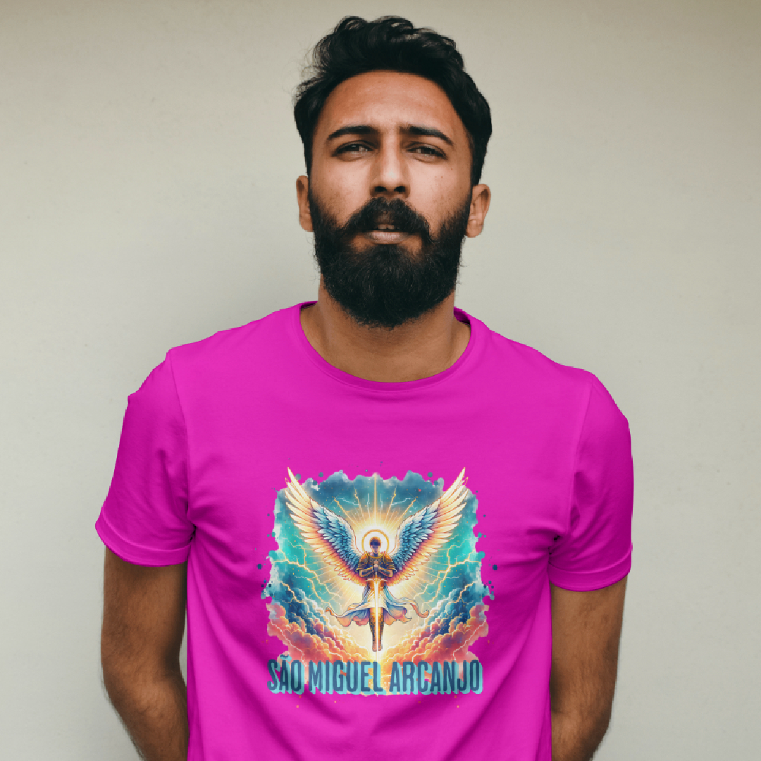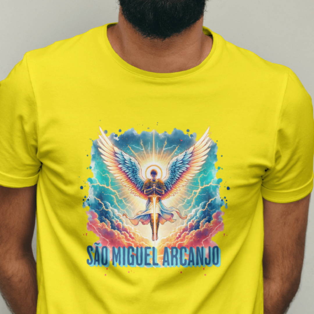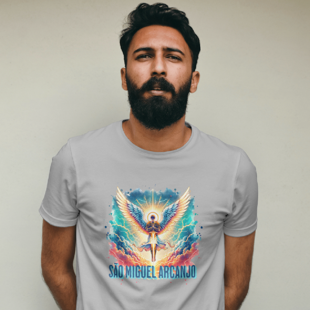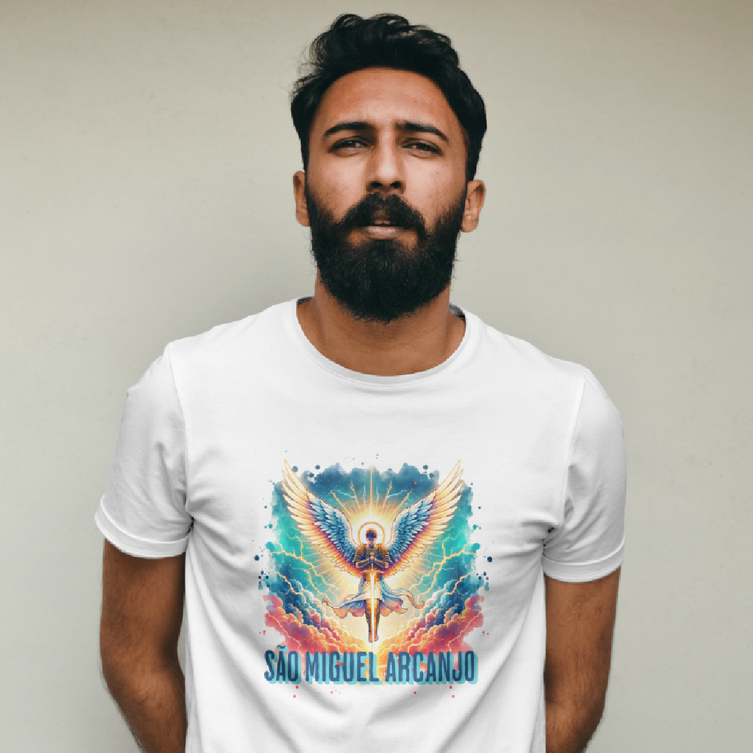Arcanjo São Miguel, o guerreiro celestial, emana força, coragem e proteção divina. Com sua espada flamejante, afasta todo mal e ilumina o caminho dos justos. Guardião das batalhas espirituais, ele representa a justiça e a fé inabalável. Vestir esta estampa é carregar sua energia poderosa, um escudo contra as adversidades e um símbolo de luz e vitória.