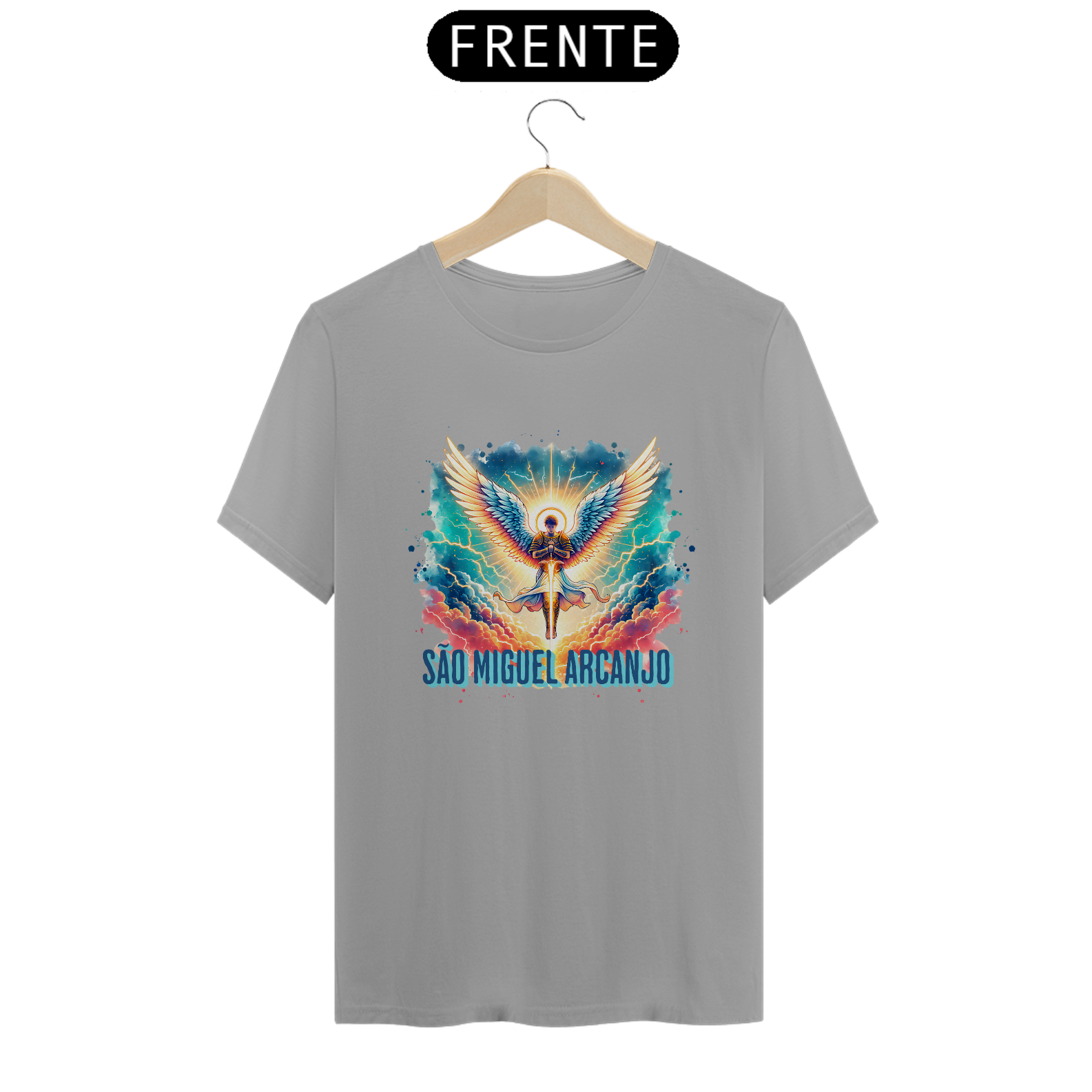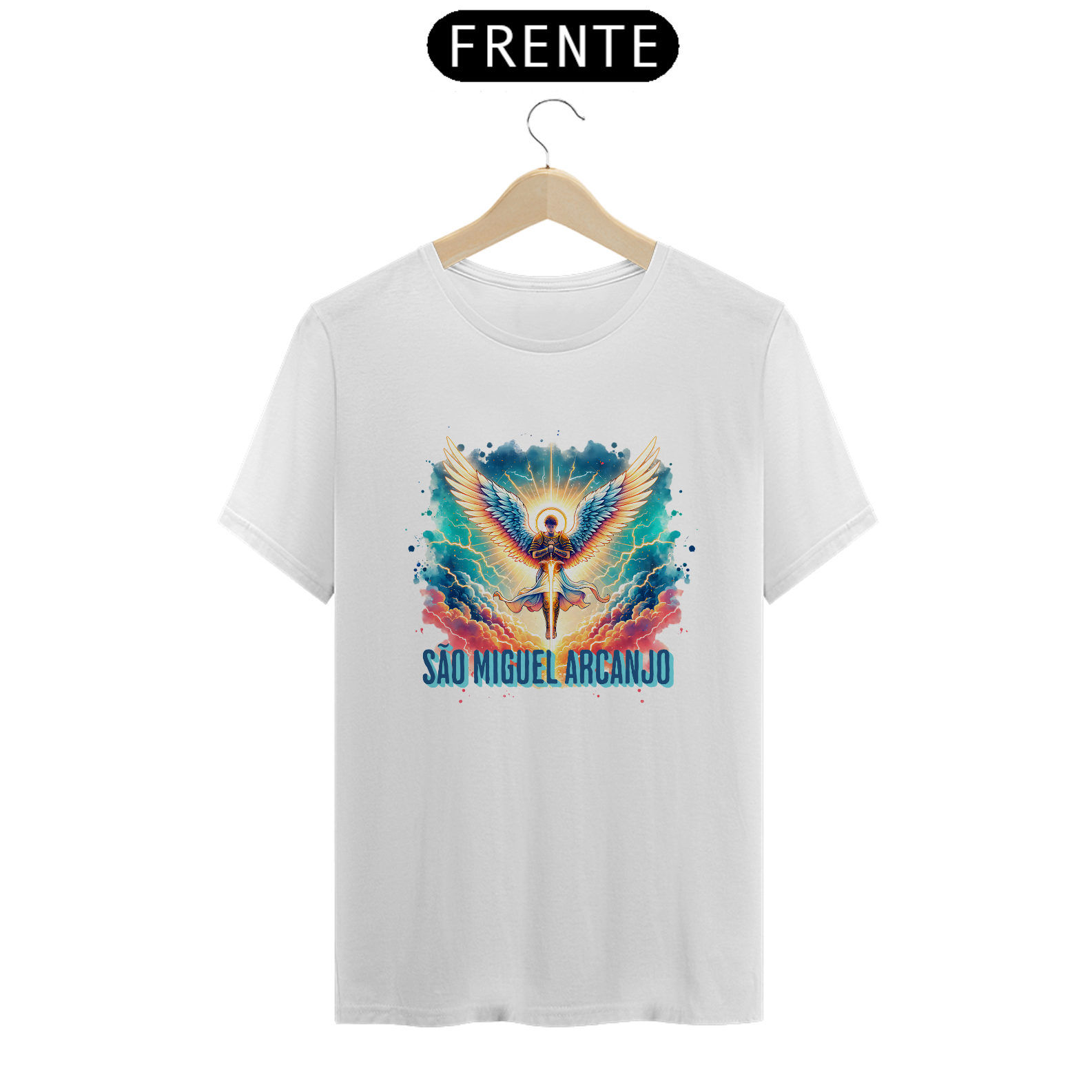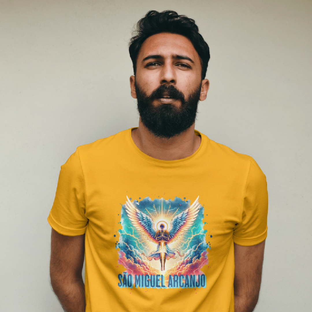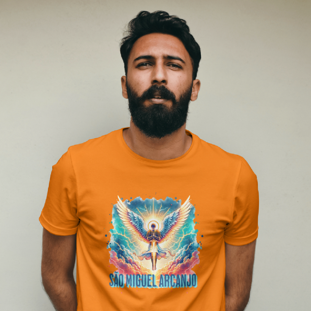 Arcanjo São Miguel, o guerreiro celestial, emana força, coragem e proteção divina. Com sua espada flamejante, afasta todo mal e ilumina o caminho dos justos. Guardião das batalhas espirituais, ele representa a justiça e a fé inabalável. Vestir esta estampa é carregar sua energia poderosa, um escudo contra as adversidades e um símbolo de luz e vitória.