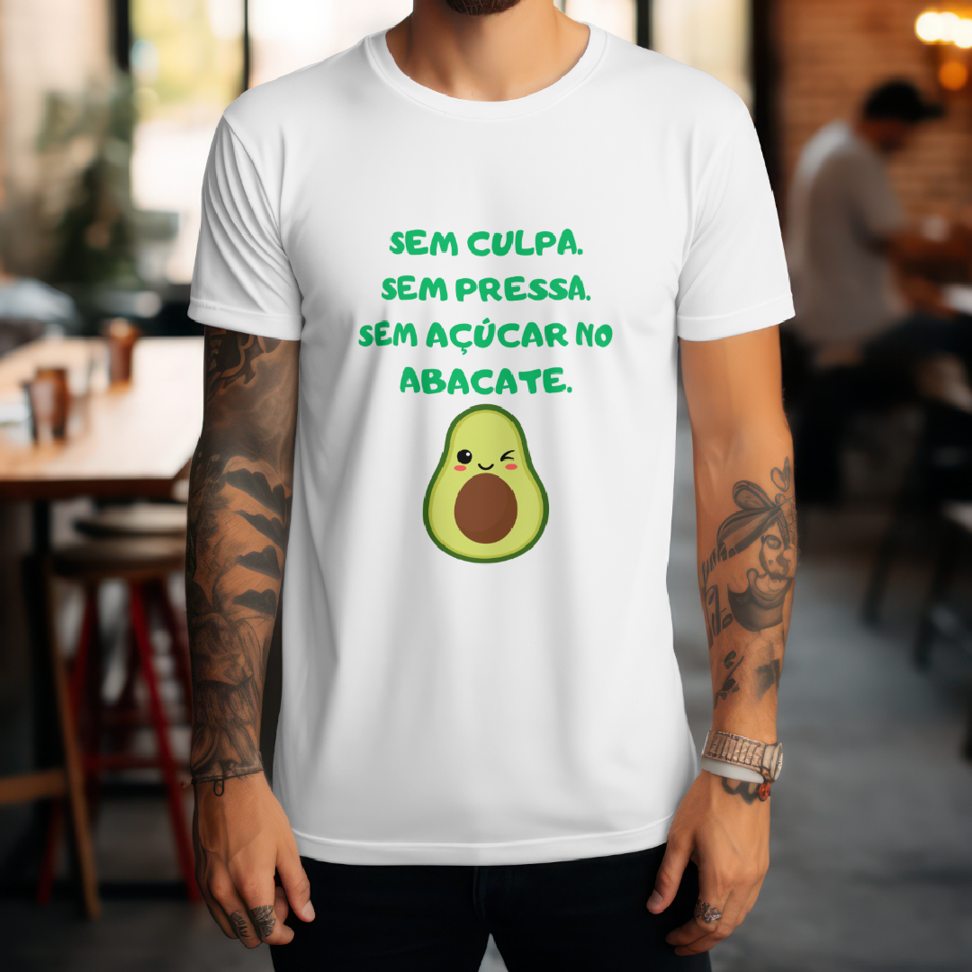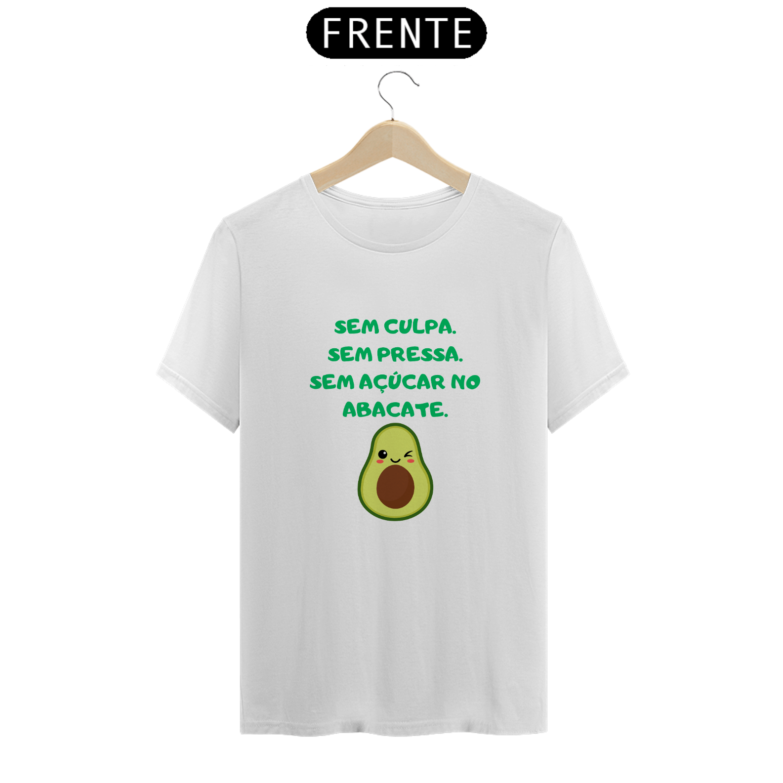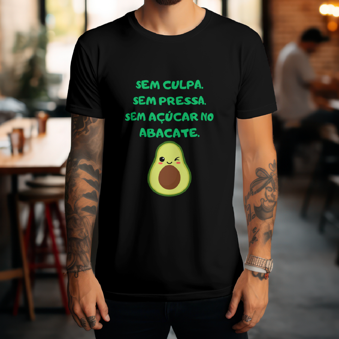 A estampa transmite uma vibe de leveza, autenticidade e vida sem excessos. "Sem culpa" remete a viver sem peso, sem se cobrar demais. "Sem pressa" fala sobre respeitar o próprio ritmo, desacelerar. E "Sem açúcar no abacate" é aquele toque divertido e provocativo, questionando a necessidade de adoçar algo que já é bom por si só—uma metáfora para aceitar a vida como ela é, sem tentar mascarar ou modificar o natural.