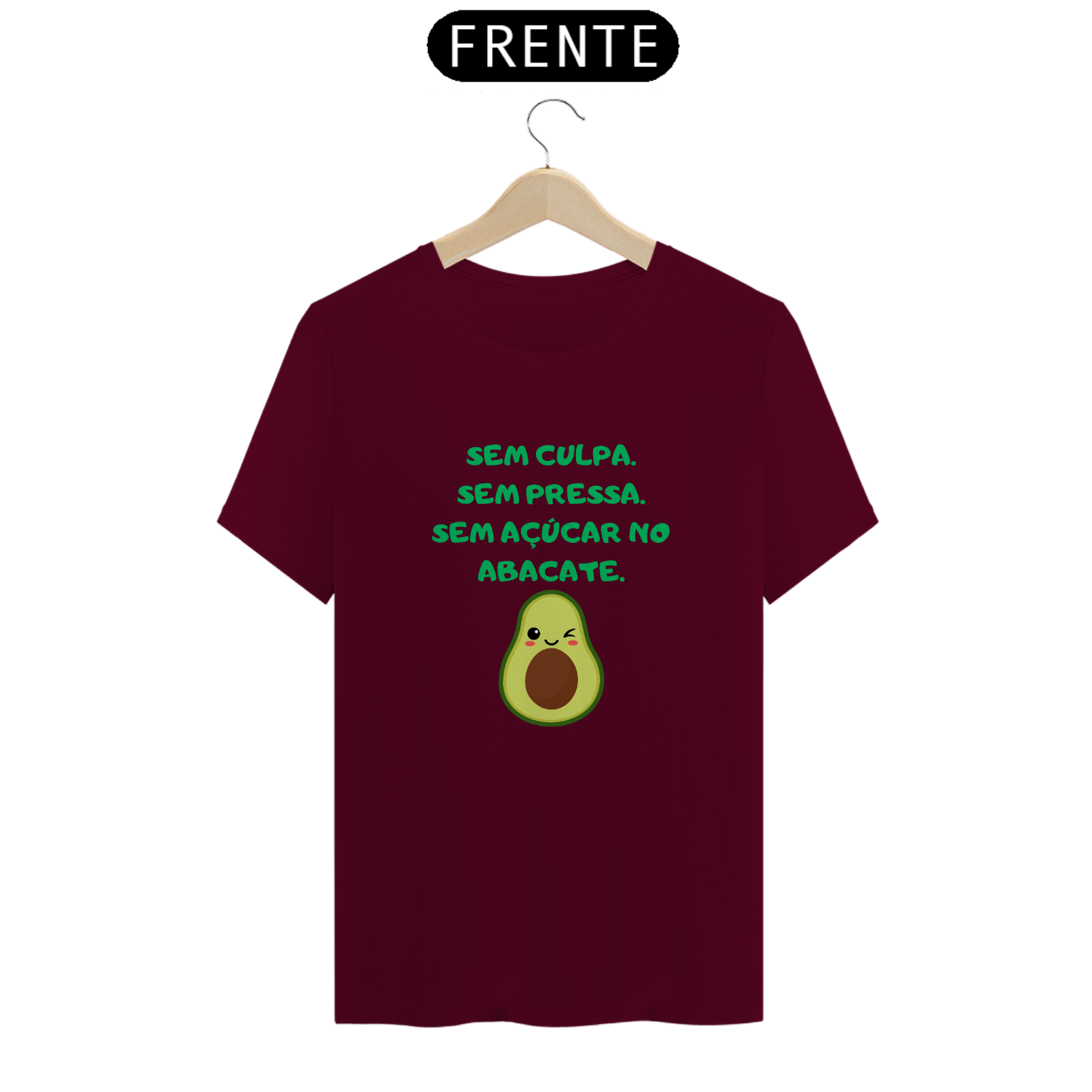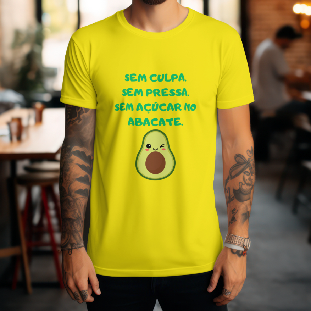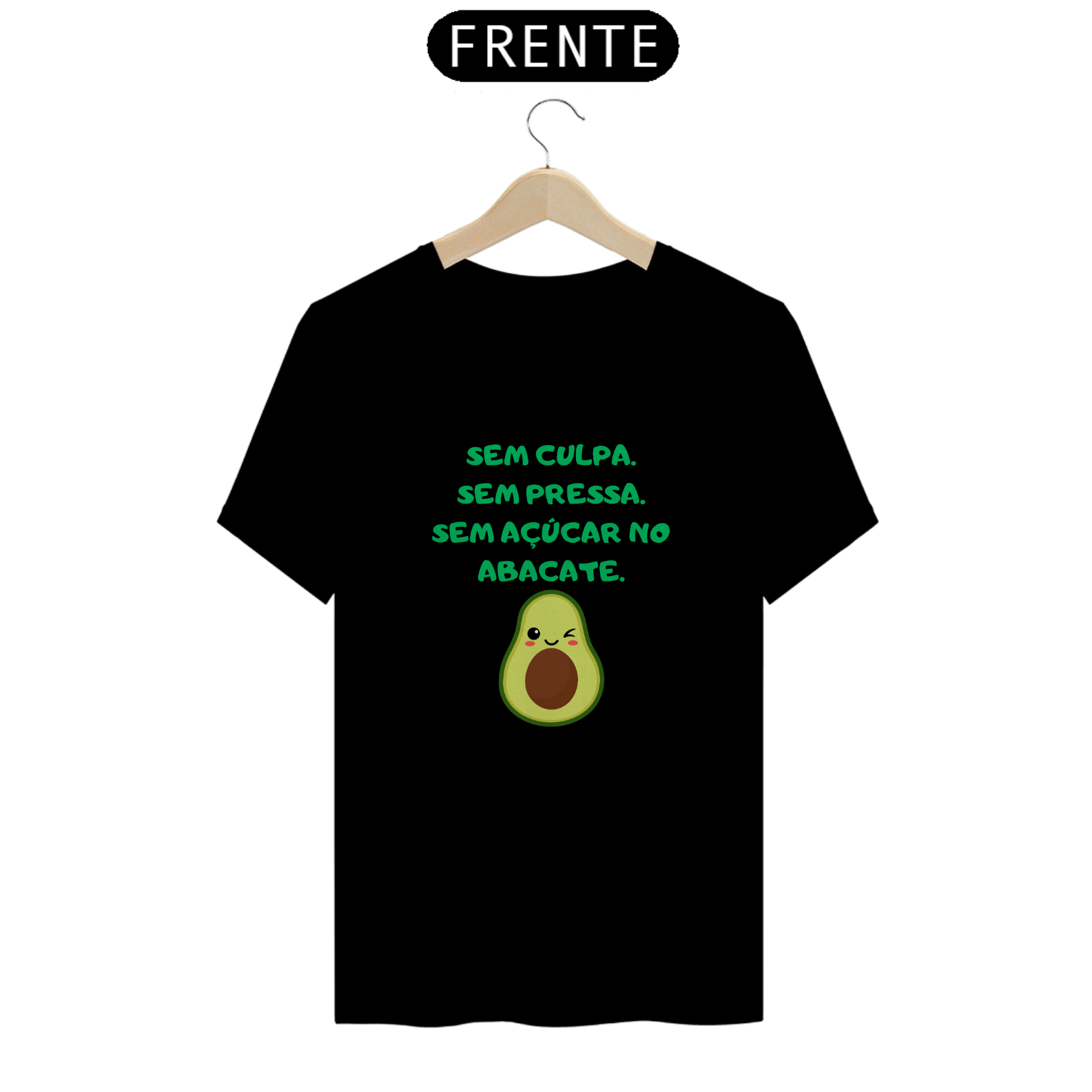 A estampa transmite uma vibe de leveza, autenticidade e vida sem excessos. "Sem culpa" remete a viver sem peso, sem se cobrar demais. "Sem pressa" fala sobre respeitar o próprio ritmo, desacelerar. E "Sem açúcar no abacate" é aquele toque divertido e provocativo, questionando a necessidade de adoçar algo que já é bom por si só—uma metáfora para aceitar a vida como ela é, sem tentar mascarar ou modificar o natural.