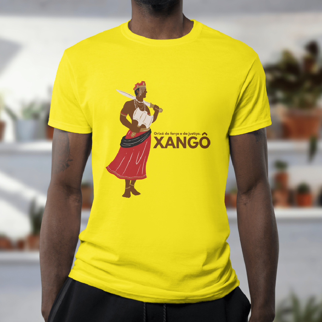 Xangô, o orixá da justiça, do fogo e dos raios. Sua força imponente e seu machado duplo simbolizam o equilíbrio e a lei. Homenageie a sabedoria e o poder de Xangô com essa estampa exclusiva. Kaô Kabecilê!